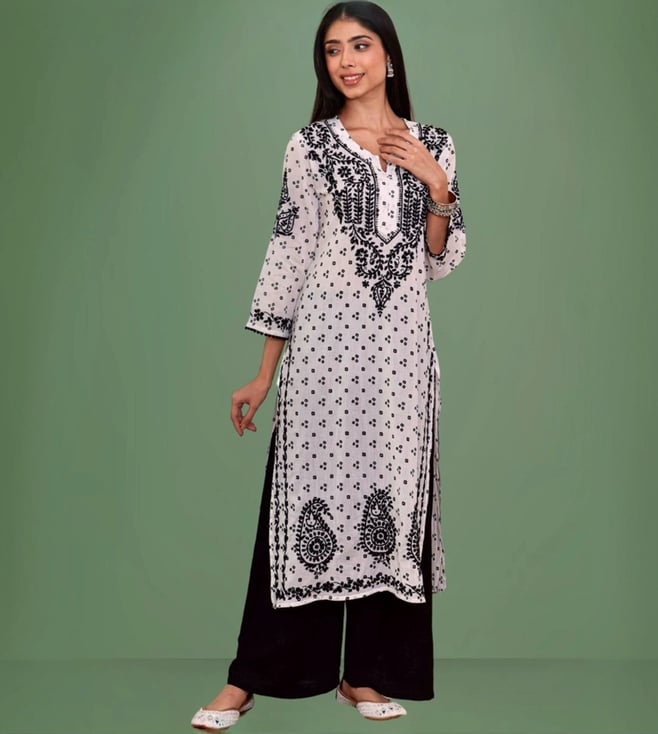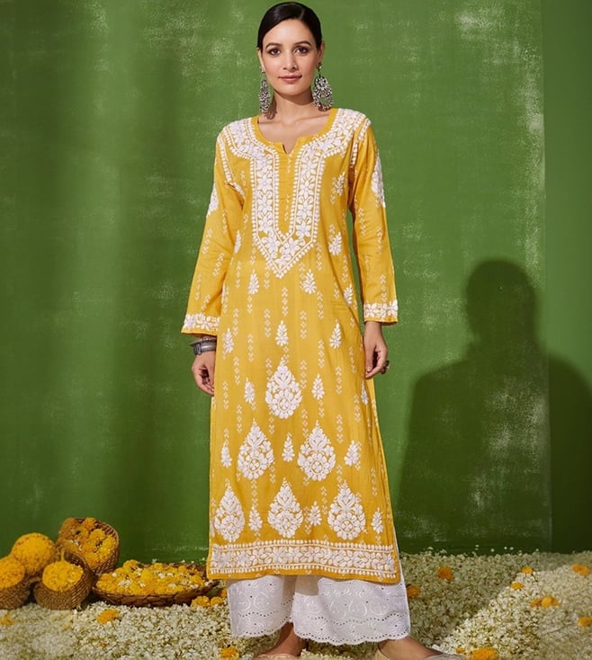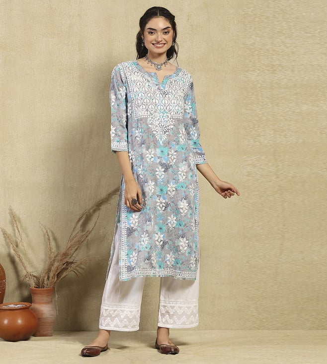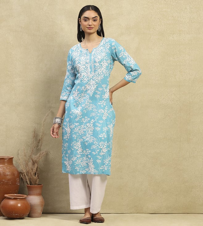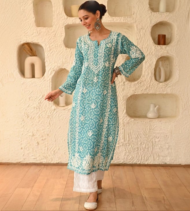 Turquoise Mulmul Straight Fit Chikankari Long Kurta