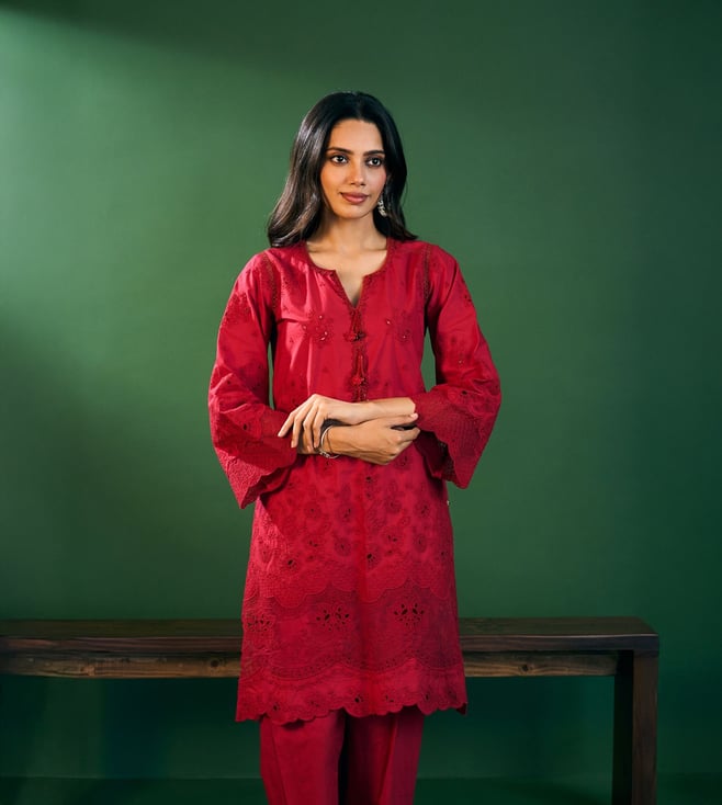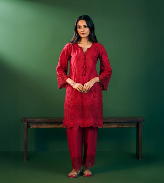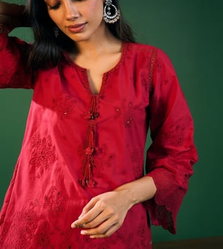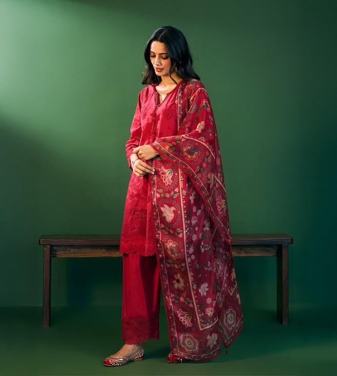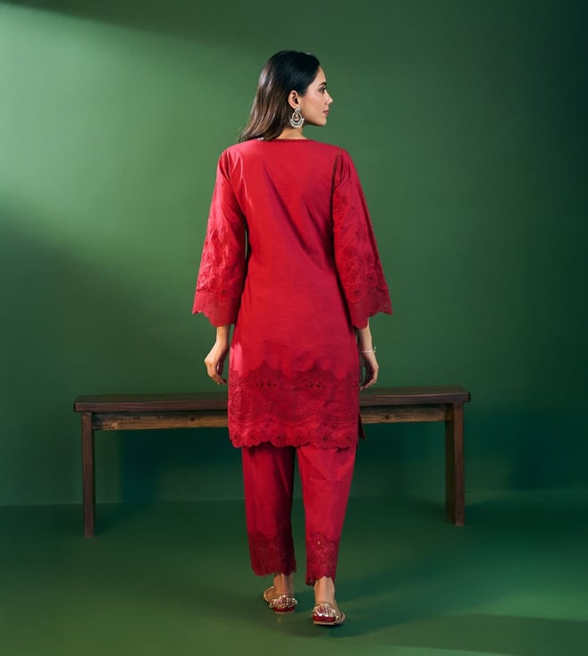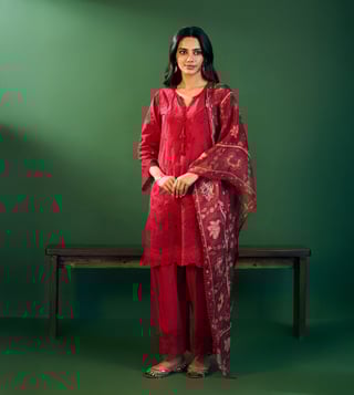Vibrant And Captivating, The Riva Kurta Set In Red Is A Celebration Of Festive Elegance. Crafted From Luxurious Supima Cotton, The Kurta Showcases Intricate Tonal Embroidery And Delicate Lace Accents That Add Depth And Dimension. Paired With Coordinated Pants For A Polished Silhouette, The Set Is Completed With An Organza Printed Dupatta Featuring Refined Detailing ¿ Perfect For Making A Statement At Celebrations And Special Gatherings.