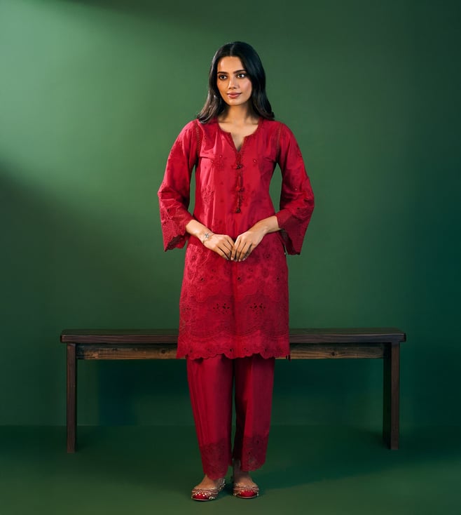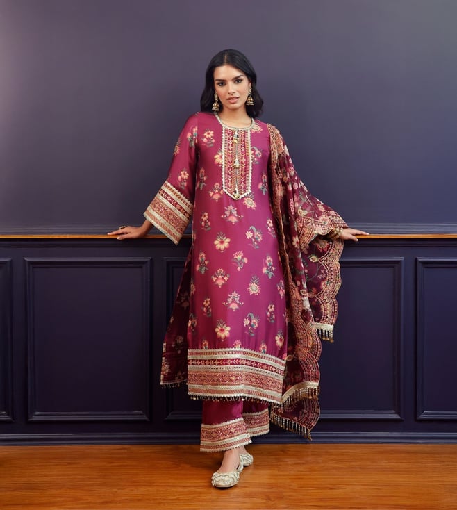Wine Cupro Satin Kurta with Pant & Dupatta
