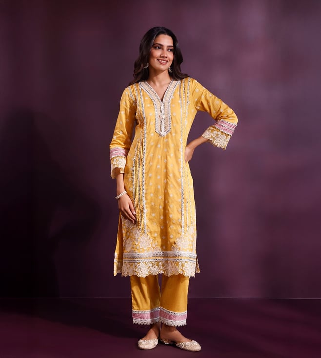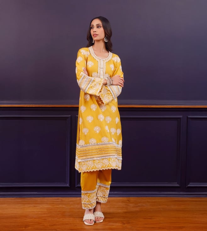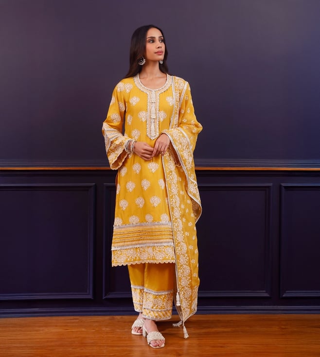 Mustard Pima Satin Kurta with Pant & Dupatta
