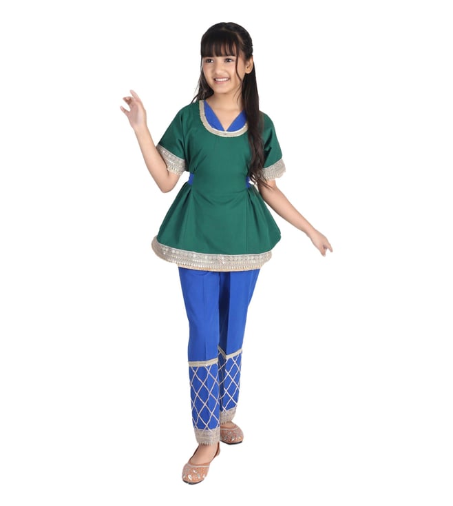 Bottle Green & Royal Blue ANTARAMBH Elsa Panelled Bow Top with Pants