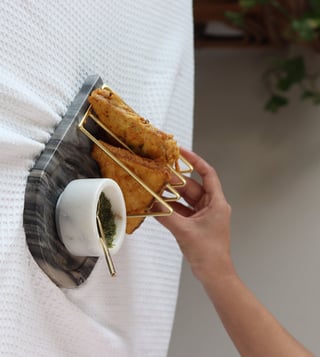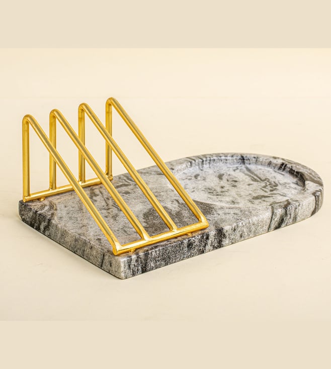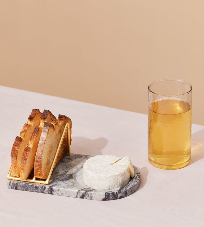 Indulge in a hotel-like breakfast experience from the comfort of your own home! Customize your tray with butter, jam, eggs, cheese, or coffee in the dedicated serving space. The one-of-a-kind grey marble pattern with elegant swirls adds a touch of charm to this practical product. And who can resist the gold-accented toast stand? It's the cherry on top of this functional and fabulous tray!