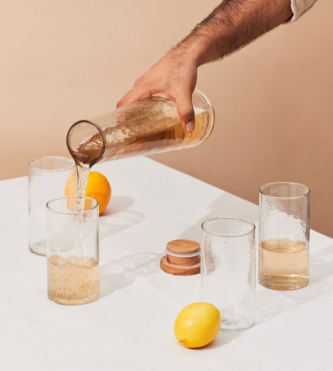 Set of four glasses, each with a mesmerizing hammered texture that adds visual depth and sparkle. Hand-blown from premium, non-toxic glass—preserving the authentic taste of your beverages. Each glass holds 500 ml, ideal for full servings and celebratory pours. Easy to clean—just rinse with lukewarm water and wipe with a soft cloth to keep them sparkling for years. Highly versatile—available as standalone glasses, or bundled with a carafe or jug to complete your serving set.