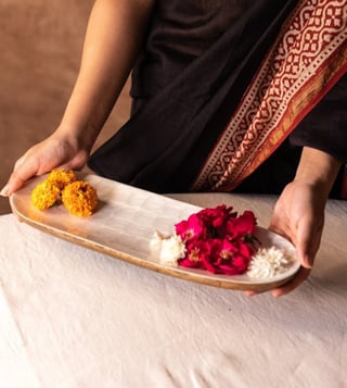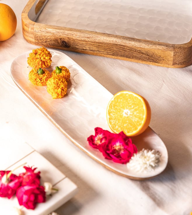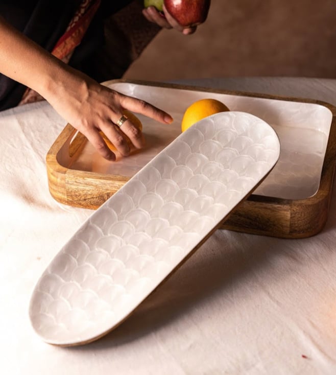 Experience a traditional yet modern dining experience with this Pearl Enamel Tikka Platter. Crafted with high-quality mango wood and finished with pearl enamel with elegant swirls, this platter is designed with an organic ellipse shape for that sleek look. The enamel has a food-safe coating which makes it perfect for tikka serving, decorations, food platters, sushi, and instant table elevation, this white and brown platter creates a beautiful table setting.