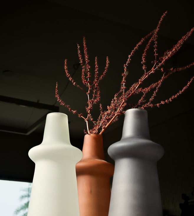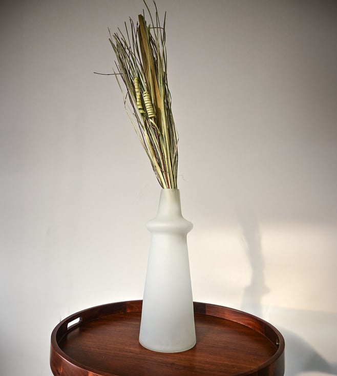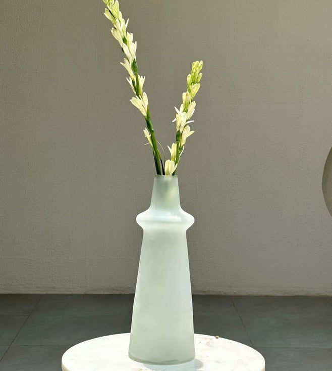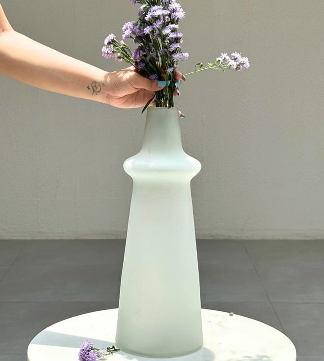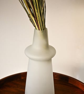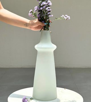 "Elevate your living space with our Ridge Glass Vases, featuring a Frosted matte finish that adds a touch of sleekness and elegance. Handcrafted in Firozabad, India, these vases seamlessly blend style and function with their Nordic design. Choose from three beautiful hues to display flowers or use as standalone decorative pieces. The tall height is perfect for bouquets and tall flowers. Get the Set of Two - Ripple Vase + Ridge Vase to complete the look!"