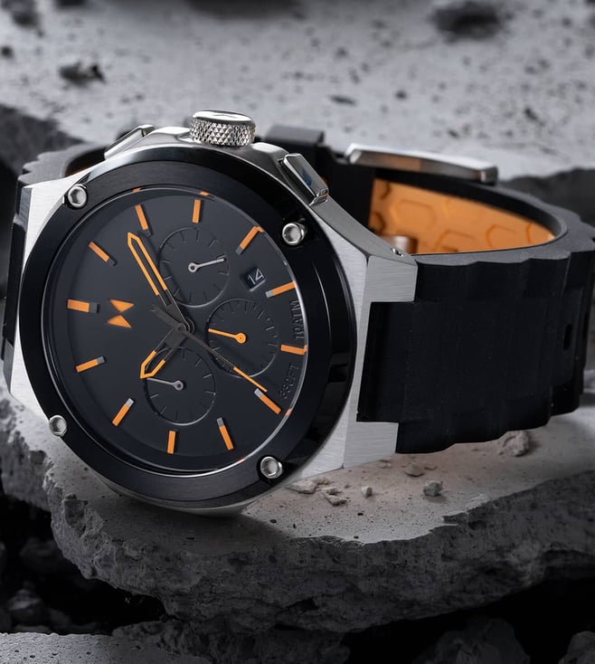 This bold Raptor chronograph watch has a 46.5 mm dial diameter and comes with a strong presence and elevated construction. Attention to design detail has been carried throughout the entire piece from the bezel screws to the sculpted links. It has a water resistance of up to 100 m. This watch is a refined adventure and technical aesthetic for Mr. Ambitious.