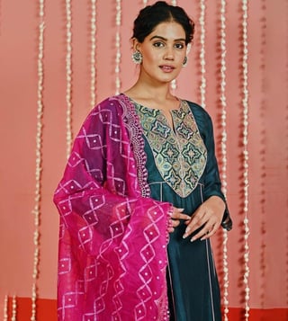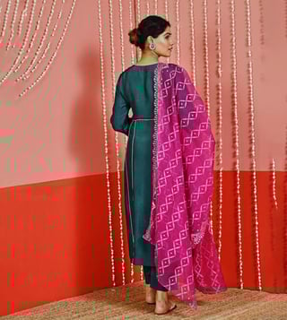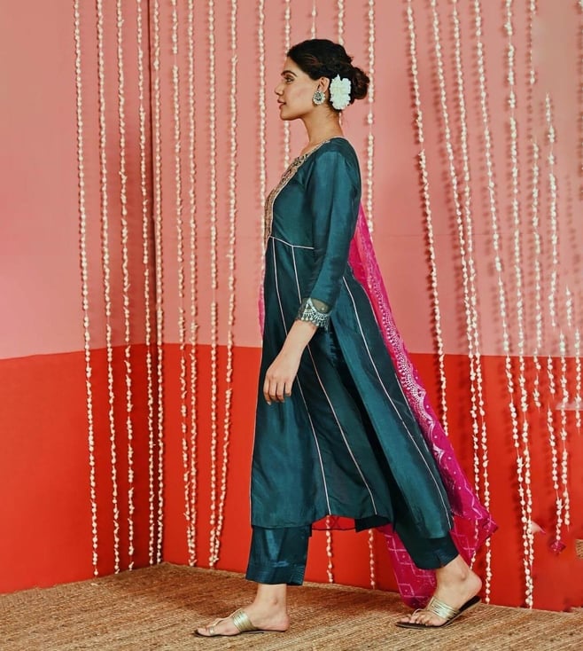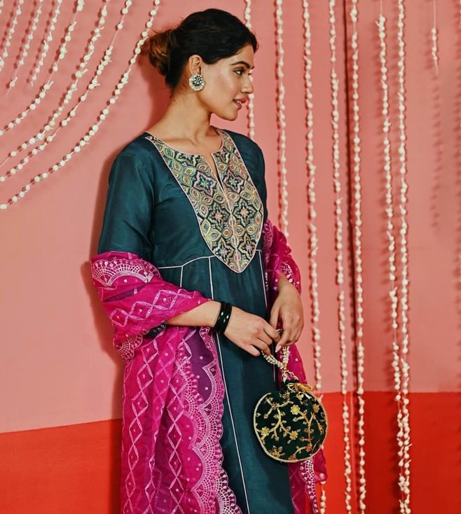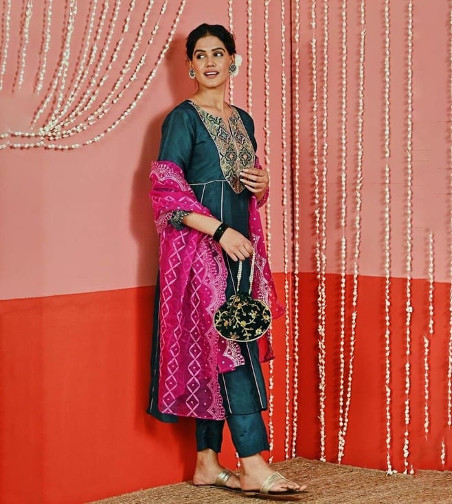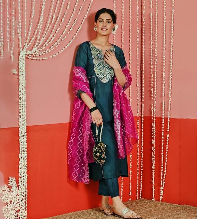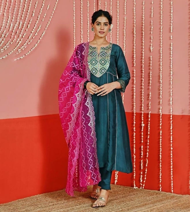 Myaara Teal Silk Blend Kurta with Pant and Organza Dupatta
