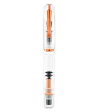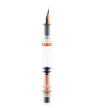 The Original: Summer follows in the footsteps of the provenly popular Original: Spring. Made out of a clear acrylic, the only colored parts of the pen are the: clip, ring, piston and nib. These components have been plated in a bright coppery orange. As always, the Original: Summer uses our in house stainless steel nibs and this demonstrator has a full view of the piston filling system.