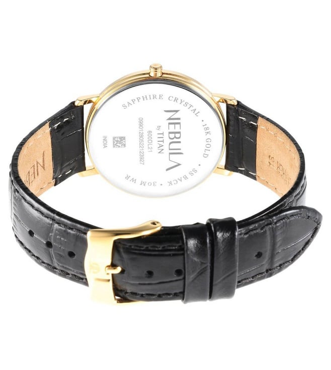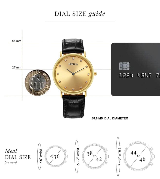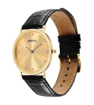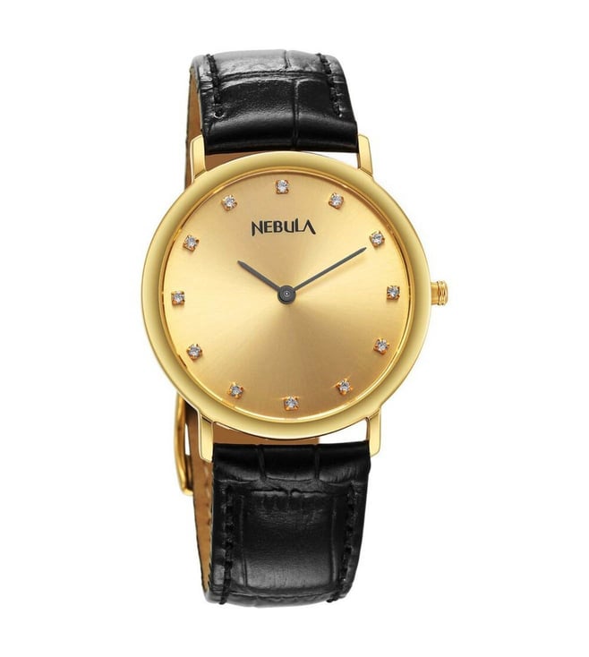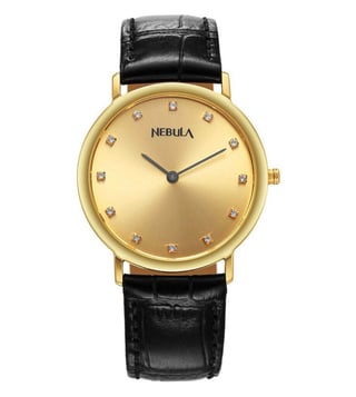 Carry great technology wrapped around your wrist with this stylish men's analog watch from NEBULA. The gold round dial is housed in a case. It exhibits and a crown for time adjustment. The gold strap comes in a black hue that further elevates the look of the timekeeper. Moreover, it is equipped with a buckle clasp to ensure a secure fit on the wrist.