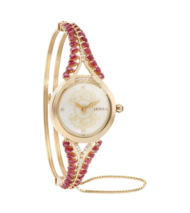 Add a modish dimension to your look with this women's analog watch from the Precious Stones collection by Nebula Watches. Encased in an 18 kt gold case, the mother of pearl round dial is functional on a quartz movement. It features plain two hands and a crown for time adjustment. The strap vaunts red ruby stones studded that enhances the look of the watch.