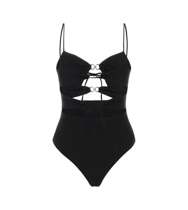 Introducing the Nensi Dojaka Black swimsuit, a stylish and versatile piece that features Stretch design, ring hardware detailing, spaghetti straps, rear tie fastening. Perfect for adding a touch of elegance to your wardrobe, this piece offers comfort and flair. Ideal for various occasions, it's designed to enhance your unique style with its detailed craftsmanship and modern appeal.
