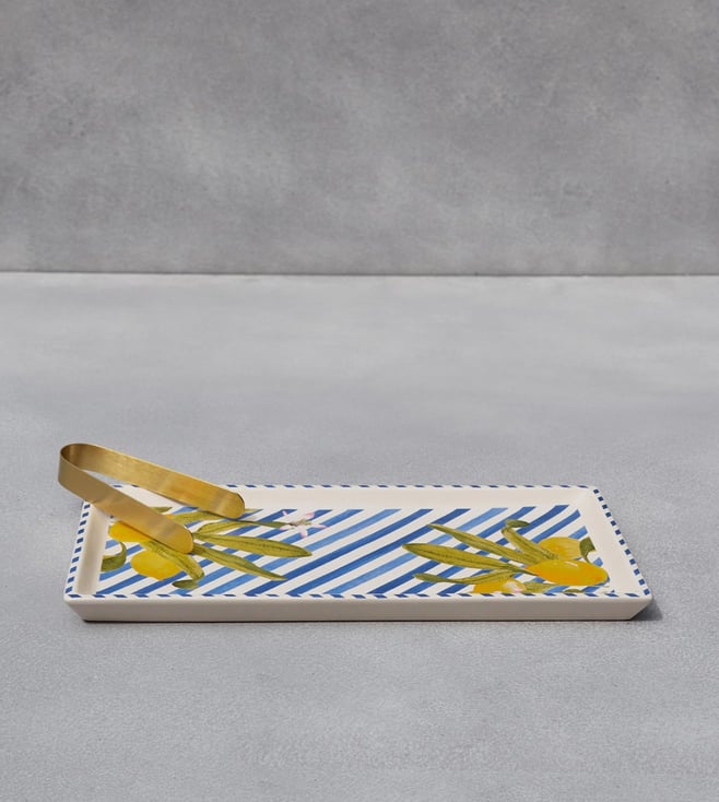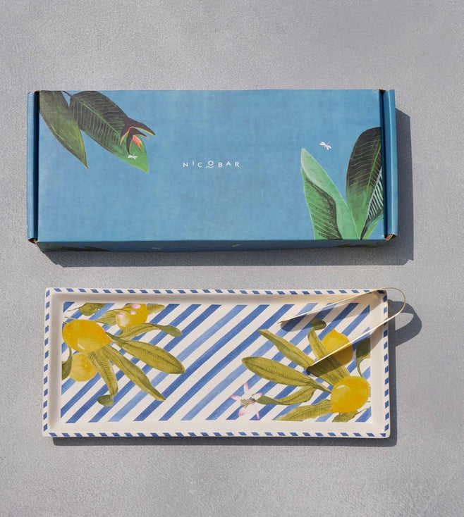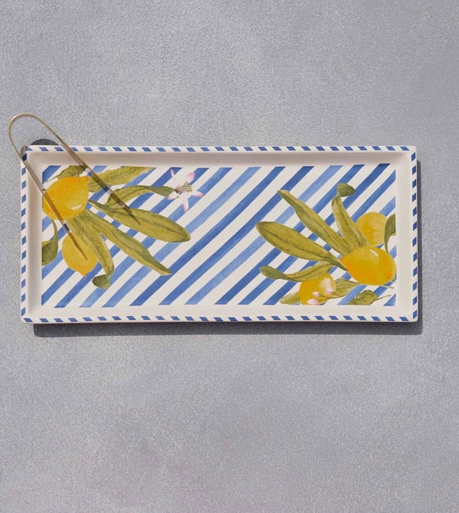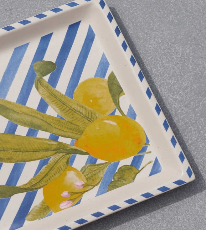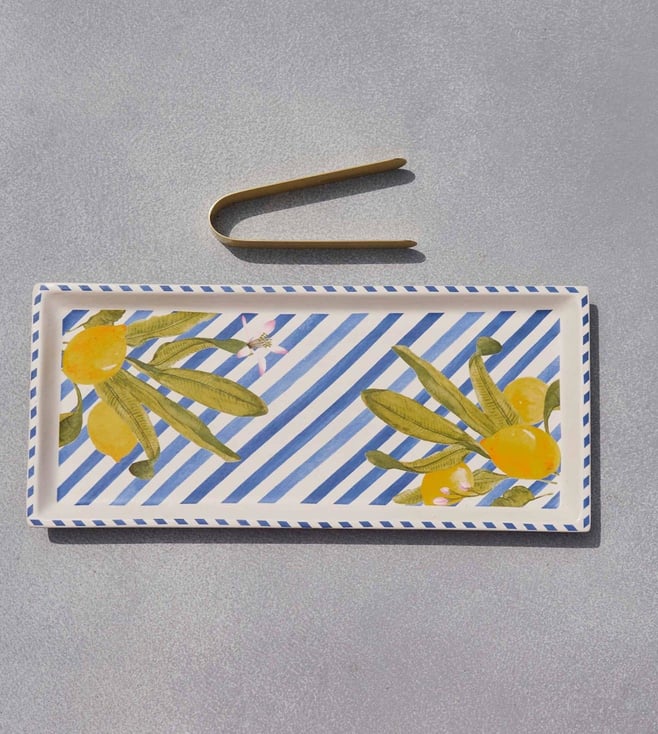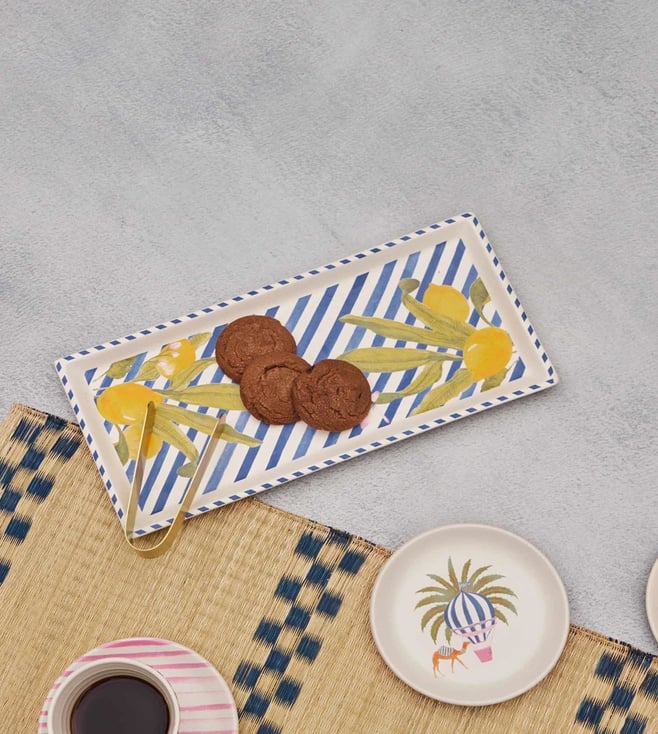 The colours and textures of Morocco, from vivid cobalt and white pottery and the flurry of lemons all around inspire the asfar cookie tray. The accompanying tong makes serving effortless. Crafted in smooth and durable stoneware, this set features a lush panaronamic view of the sights of the region. Pair with our tea plates and coasters for a complete setting.