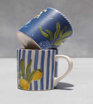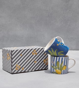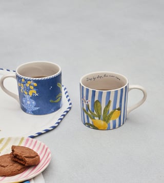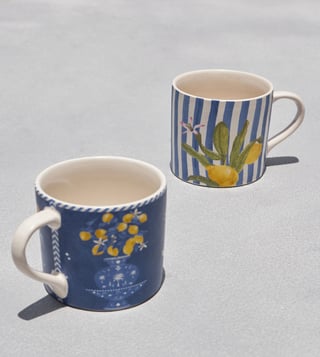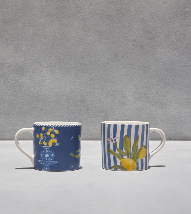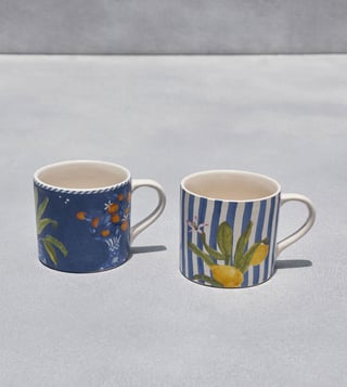 The colours and textures of Morocco, from vivid cobalt and white pottery and the flurry of tangerine and lemon all around inspire the asfar straight mugs. Crafted in smooth and durable stoneware, this set features a lush panaronamic view of the sights of the region. Pair with our tea plates and coasters to drink fuss-free and in style. Comes in a gift box.