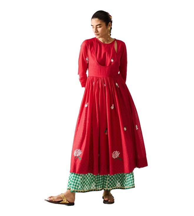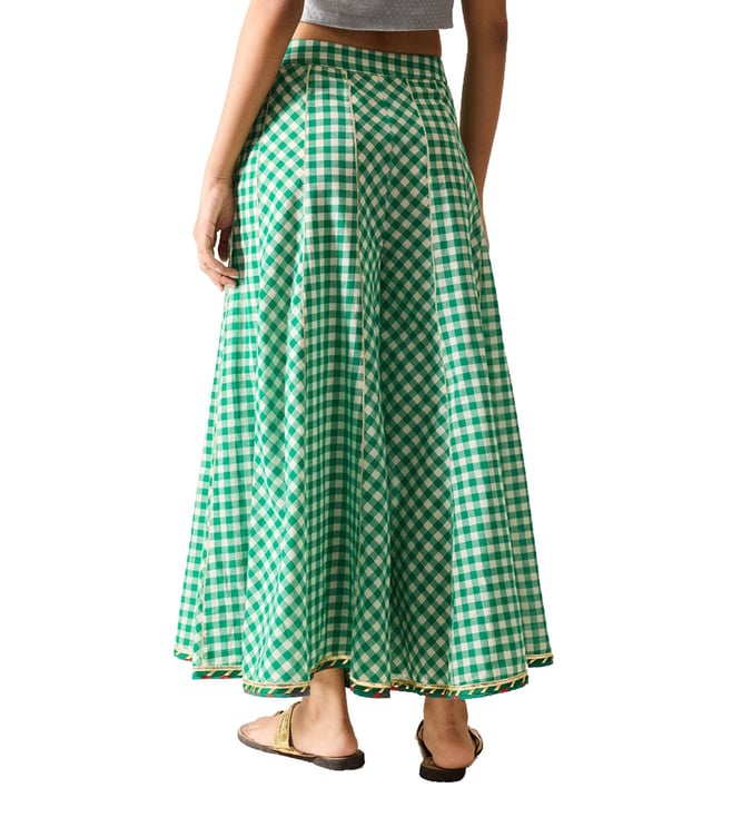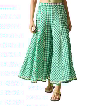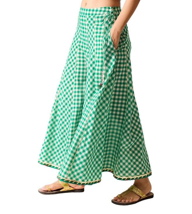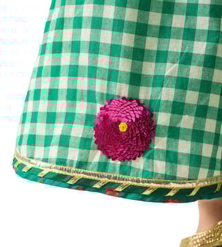 Crafted In 100% Yarn-Dyed Cotton Checks, The Awadh Sharara Features A Palette Of Ivory And Green For A Refreshing, Heritage-Inspired Look. Subtle Embellishments Enhance The Charm-Gota Detailing Runs Along The Kalis And Bottom Hem, Finished With Handmade Tassels That Add Playful Movement. A Delicate Fuchsia Sequin Lotus Flower Is Hand Embroidered On The Just Above The Gota Hem.