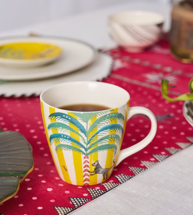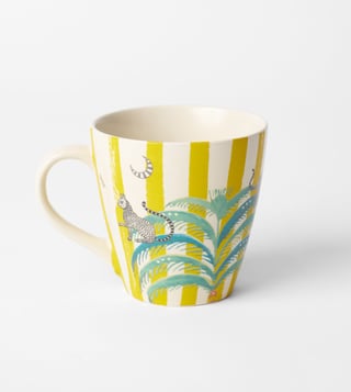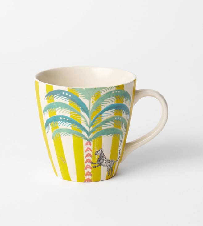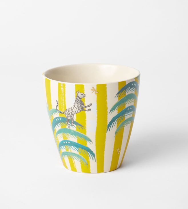 The bagh conical mug features prowling leopards and stately palms set against a bold yellow and ivory striped base. Crafted in stoneware with a soft gold highlight, it is designed to bring a little drama to your morning brew. Use it solo or stack with the rest of the bagh set, this one¿s got personality in every sip. Capacity 300 ml
