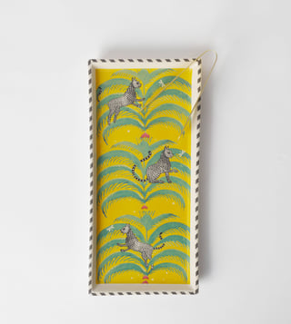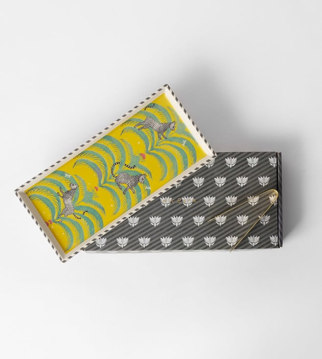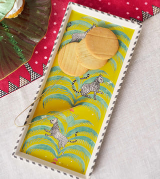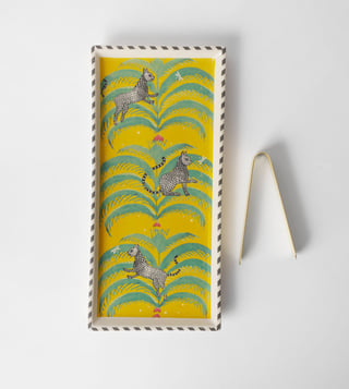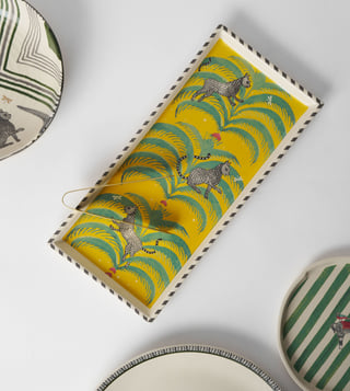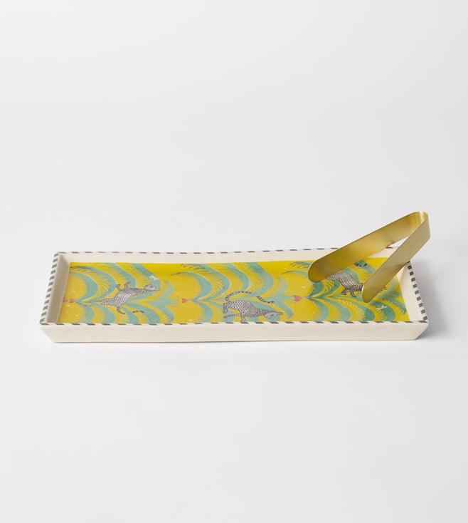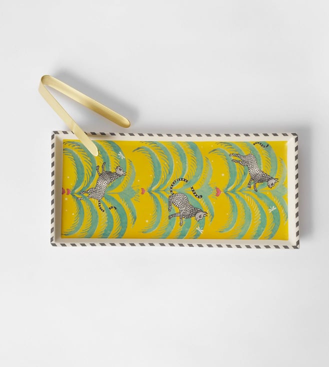Bright, bold and a little wild, the bagh Cookie tray is made to make an entrance. Set against a vivid yellow base, it features prowling leopards and the evergreen palm motif, tropical, timeless and a little tongue-in-cheek. Crafted in stoneware and paired with a handy set of tongs, it is perfect for everything from cookies to cocktail snacks. Excellent to gift or keep. Comes in a gift box. Material stoneware and stainless steel.