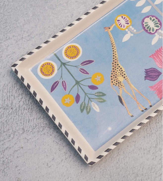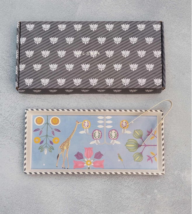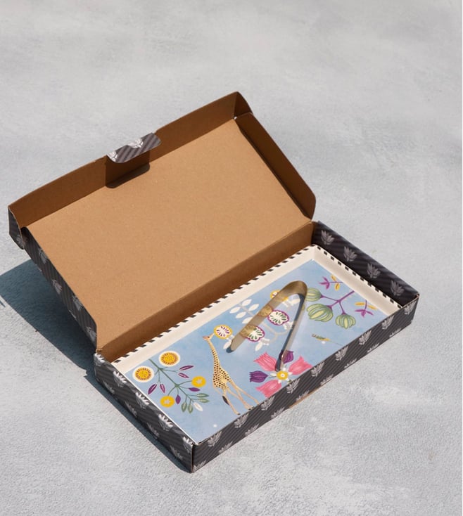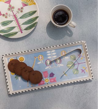 The bahari cookie tray, adorned with detailed motifs of custard apple blooms, giraffes, and waterlilies, comes with an accompanying tong to serve in style. Make it the centrepiece of your gatherings and serve your best creations on it. The included tong allows for easy and graceful serving, keeping your cookies mess-free and your hands clean. The clean lines and sharp edges in charcoal and ivory add a signature Nicobar touch to the tray's charm. Mix and match with our other Bahari and Madagascar dinnerware pieces featuring complementary patterns to create a complete table setting.