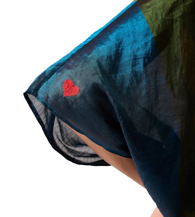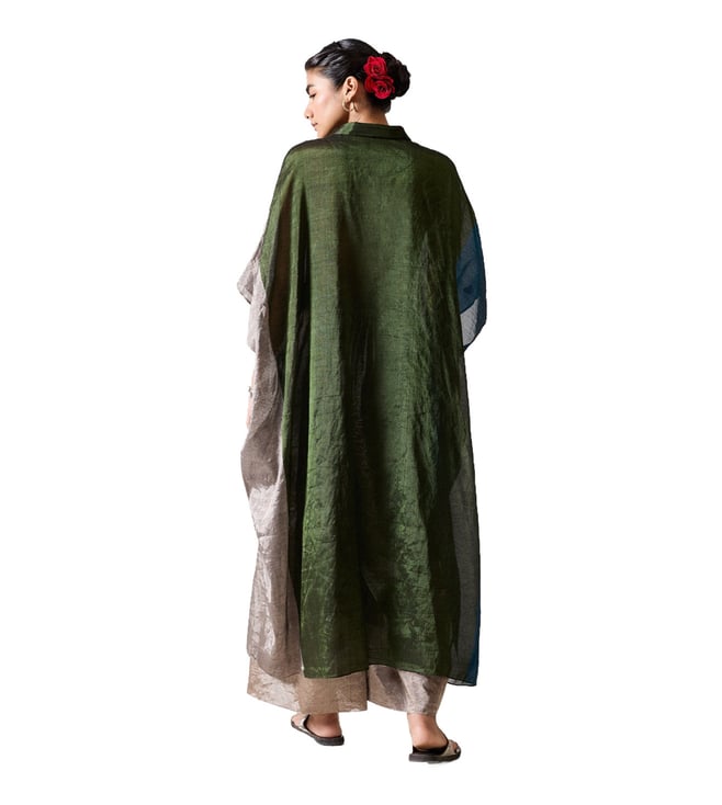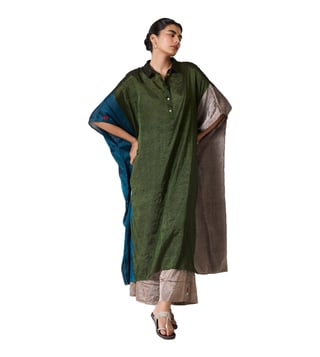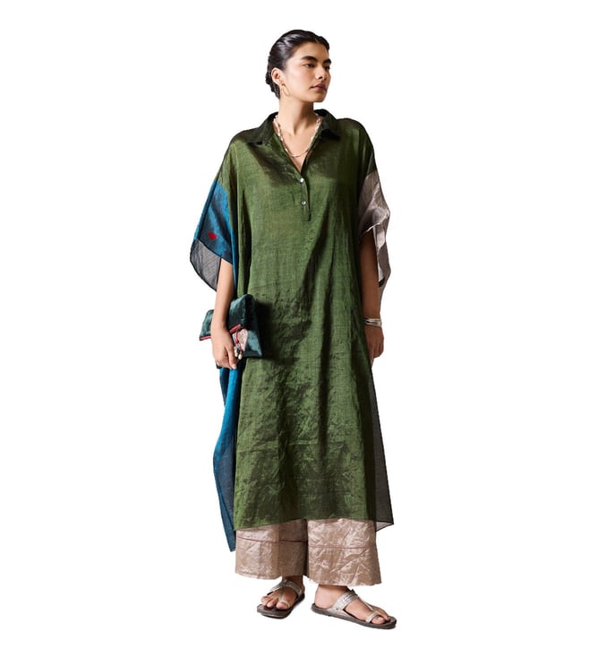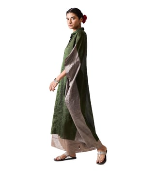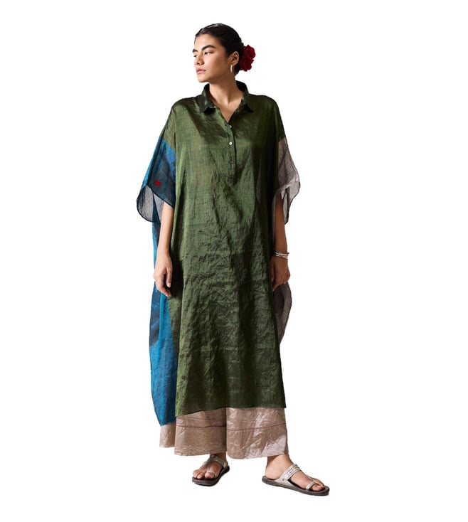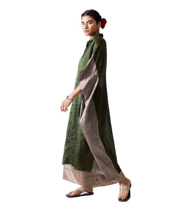 Radiant And Statement, This Collared Kaftan Is Crafted From Shimmering Metallic Tissue That Captures Light With Every Movement. The Rich Emerald Base Is Beautifully Contrasted By Deep Navy And Silver Accents, Creating A Striking Interplay Of Hues. The Second Button On The Placket Is Stitched With A Bold Red Thread. The Navy Side Of The Fabric Features Prominently On The Wrists, Offering A Harmonious Contrast. A Delicate Mukaish Rose Embroidery Graces The Center Of The Blue Sleeve Hem, Adding To Its Design.