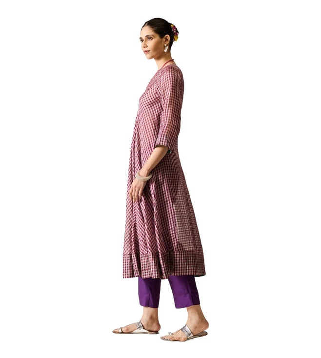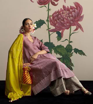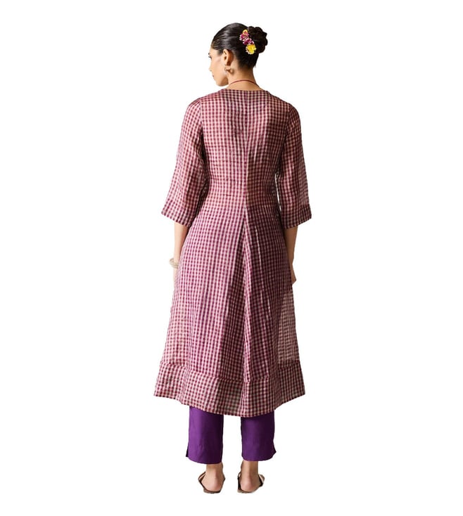 A Graceful Blend Of Shimmer And Structure, The Domino Kurta Is Crafted From Metallic Tissue Featuring A Striking Purple And Silver Check Pattern That Catches The Light With Every Movement. Designed With Subtle Luxury, The Kurta Includes Shell Fabric Pockets. An Exquisite Green And Gold Floral Buta Embroidery Adorns The Sleeve.