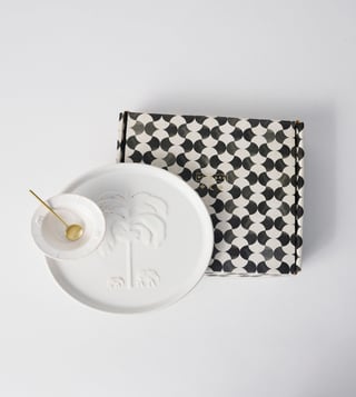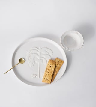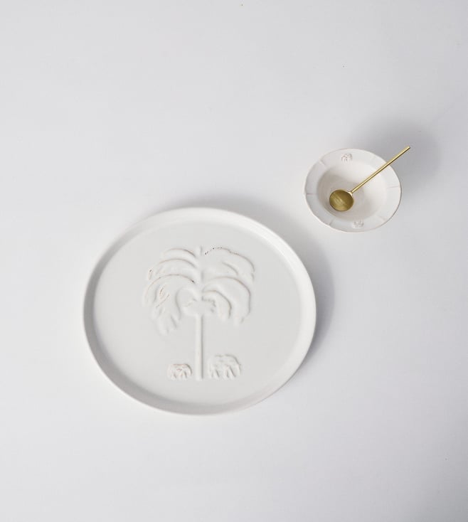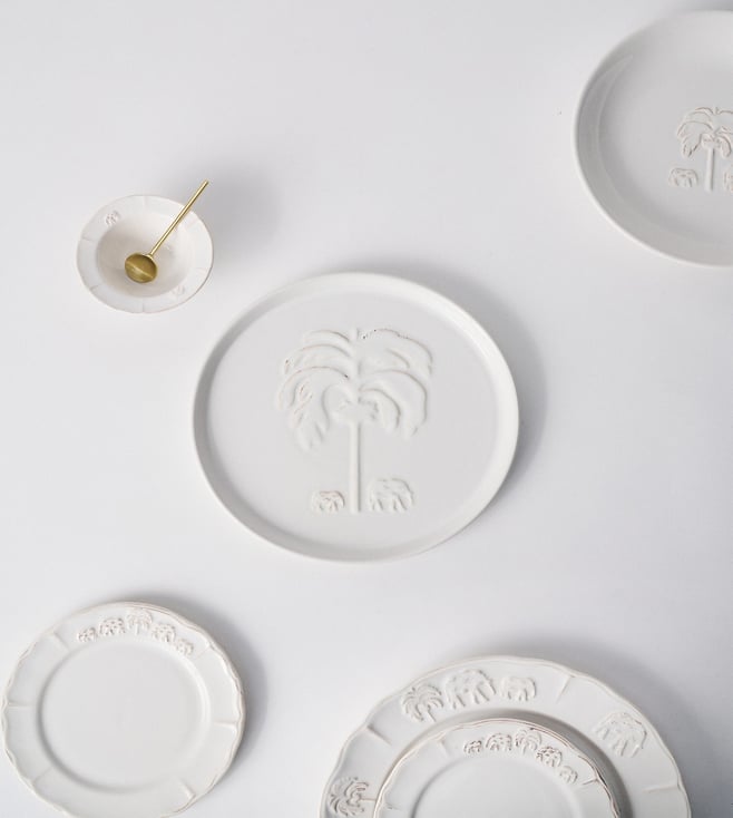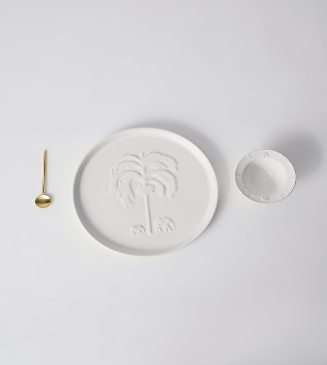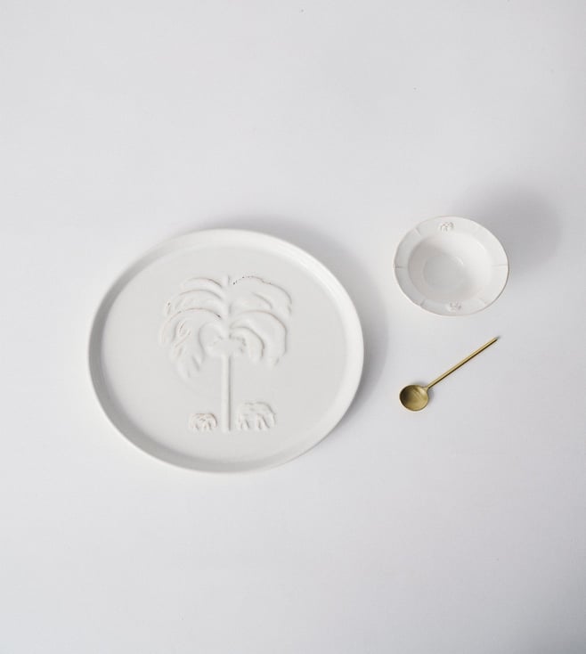 A go-to for effortless entertaining, the Ele Palm Chip and Dip Platter is designed for serving dips, crudit�s, and snacks. Made from durable stoneware in classic ivory hues, it comes with a coordinating bowl and spoon. A Nicobar favThisite that brings easy whimsy to every gathering.