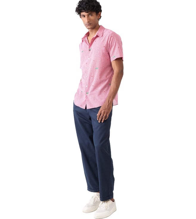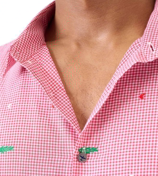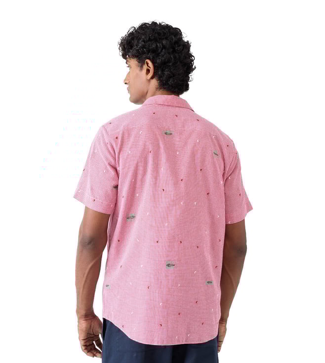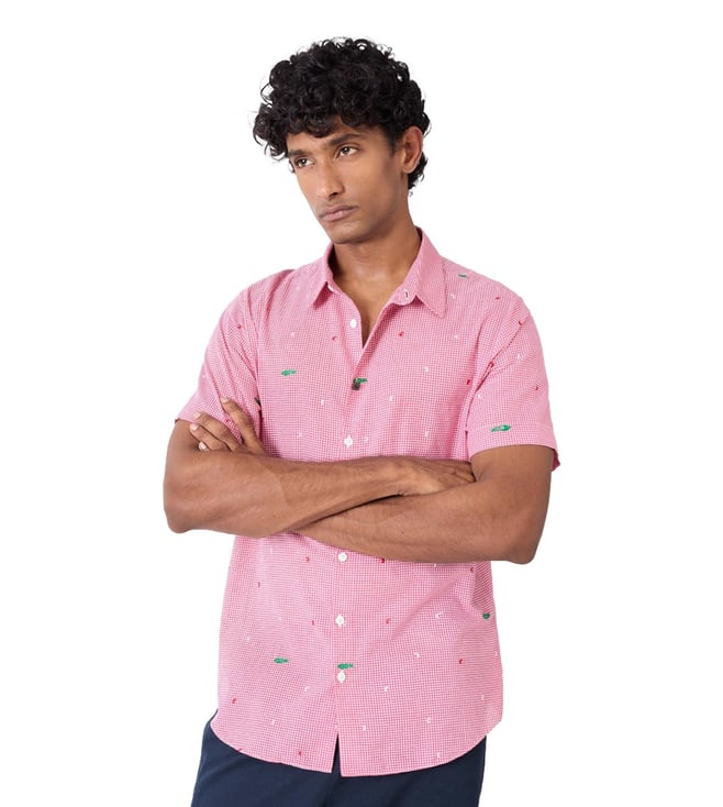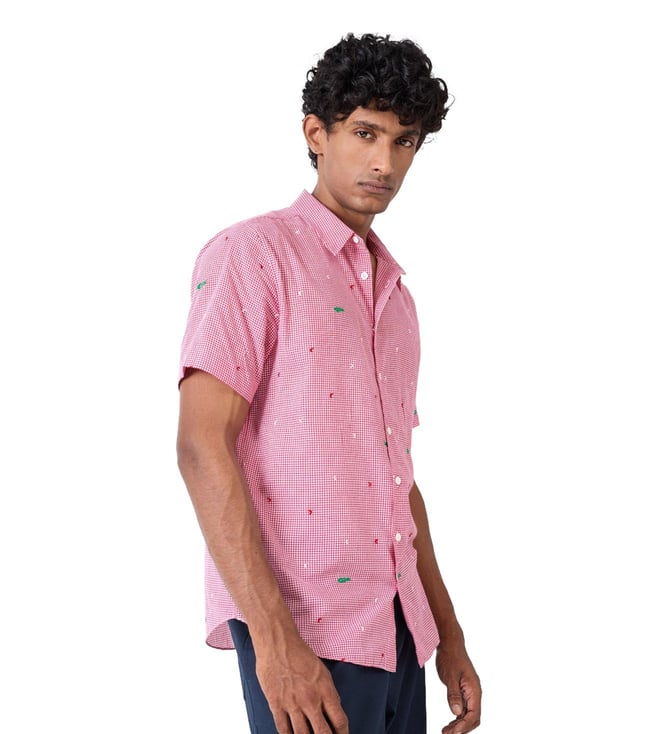 A soft and structured shirt that¿s perfect for dinner plans and island getaways alike. Crafted in 100 percent yarn-dyed cotton, it features tiny watermelon and white checks with all-over fish embroidery in green, red, and white. A navy plane button at the second placket spot adds a subtle contrast to the playful pattern. With its classic fit and half sleeves, this one pairs effortlessly with everything from jeans to trousers for an easygoing, pulled-together look.