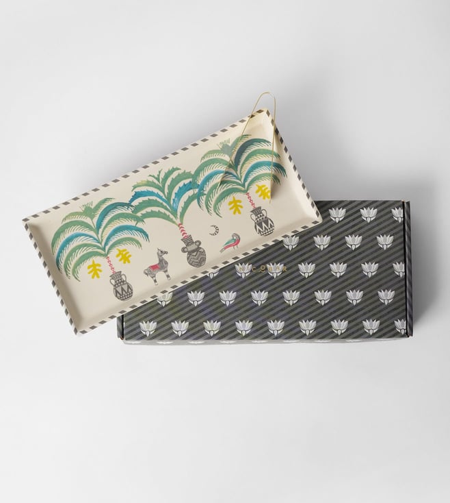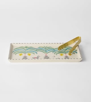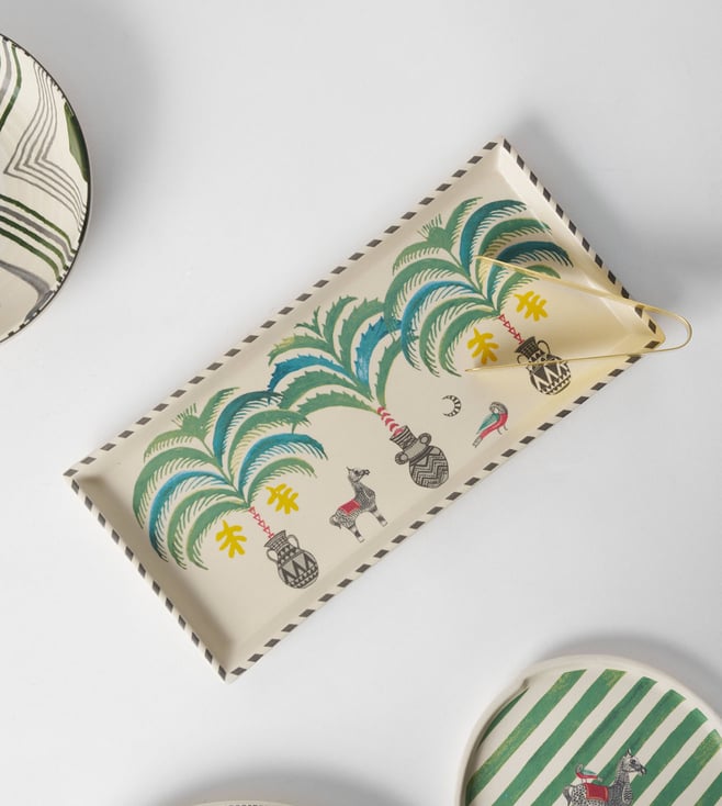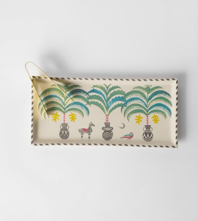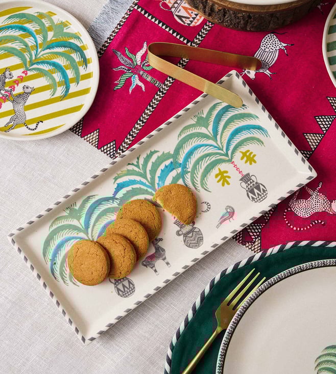 Rooted in the past, designed for your present table, the indus Cookie tray is an everyday classic with a twist. set on an ivory base with striped edges, it features motifs of ancient vases, the palm and a horse, drawn from indus iconography and reimagined with colour and clarity. Crafted in stoneware and paired with a matching set of tongs, it is ready for everything from tea-time treats to after-dinner bites. Excellent to gift or keep. Comes in a gift box. Material stoneware and stainless steel.