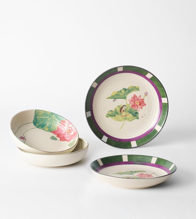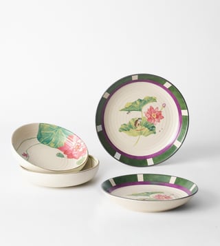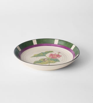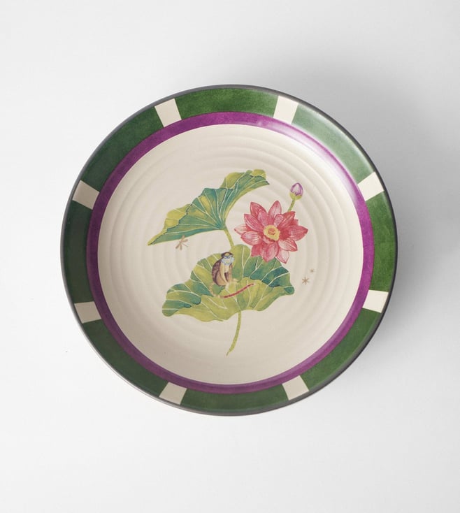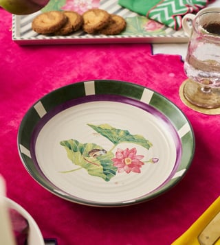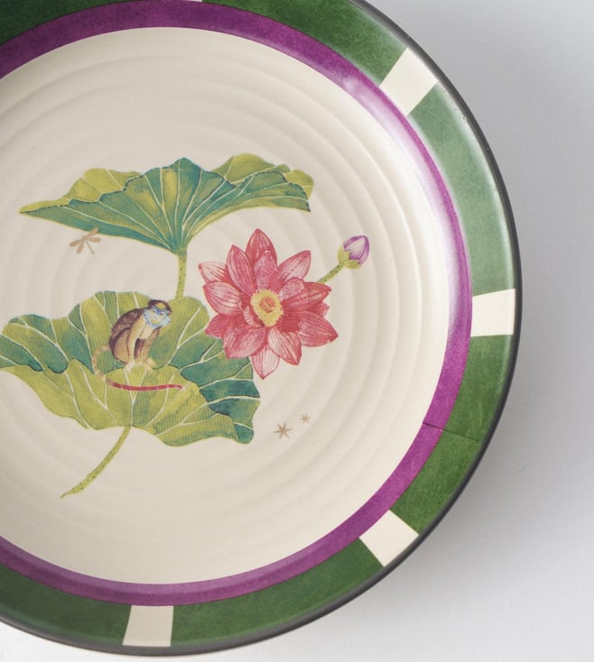 A lotus blooms across the centre of this plate, it is leaves fanning out in soft greens and gold-speckled detail. Among them sits a small monkey, calm and curious, as if pausing mid-journey through an Indo-Chine garden. The borders in purple and green frame the scene like a painted scroll, inviting a closer look at every detail. Crafted in durable stoneware, this plate is perfect for generous servings from noodles and pasta to festive mains making each meal feel like part of a story. A piece that brings nature, craft, and quiet narrative to your table, it layers beautifully with collection.