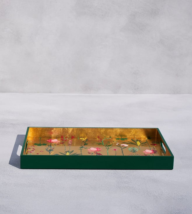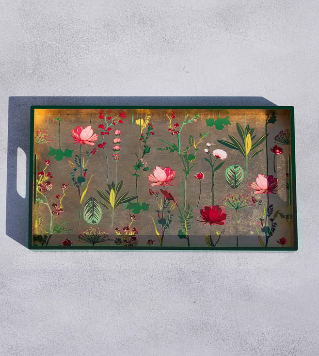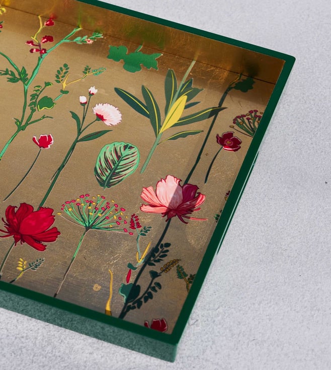 A laquered wooden tray peppered with floral motifs. Use it to serve your meals or to house your collectibles. Great for gifting and to keep.