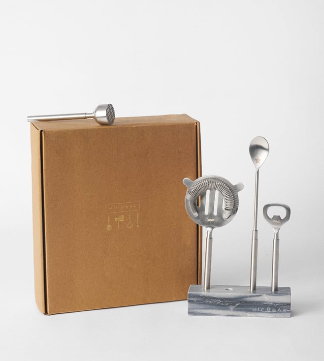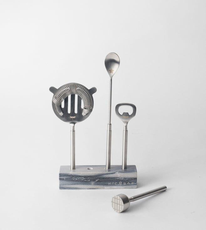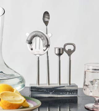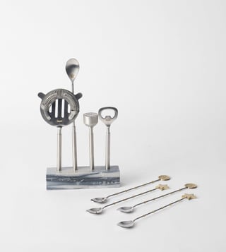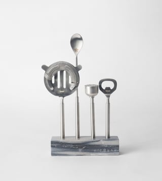 The Oro Bar Tool Set is a sleek addition to any home bar, combining function and design in one polished set. It includes a muddler, strainer, opener, and spoon stirrer, all finished in gold and silver tones, with a charcoal marble base to hold them neatly in place. Crafted for mixing, pouring and entertaining with ease, this set is as practical as it is striking. A thoughtful gift or a timeless upgrade for your own bar, designed to make every cocktail feel considered. Comes in a gift box. Product material marble and stainless steel.