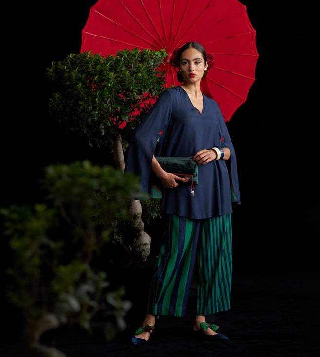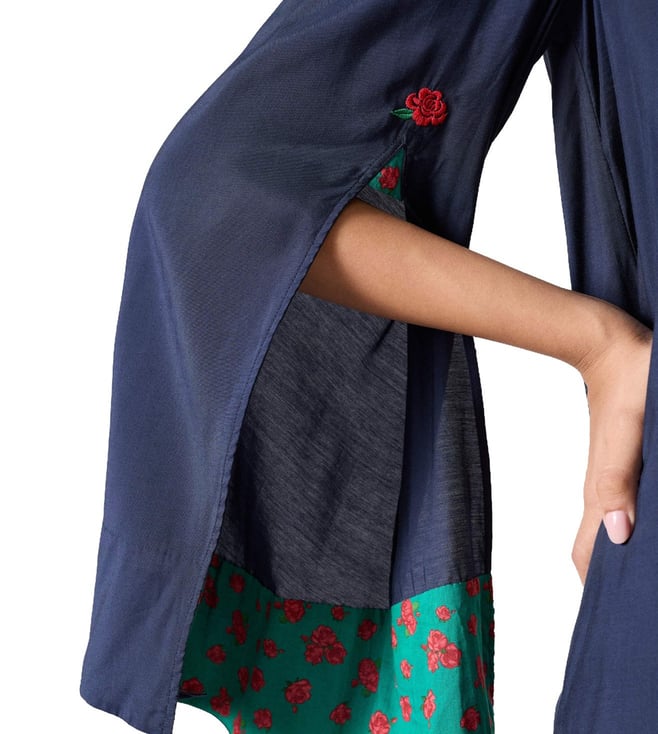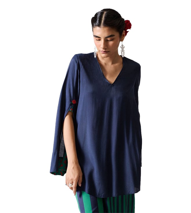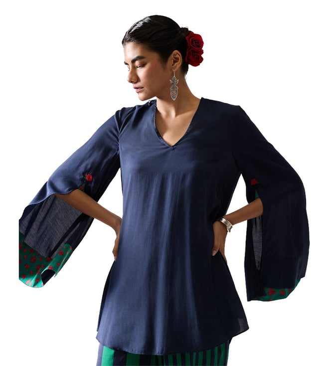 The Panaji Top Is A Wardrobe Essential With A Touch Of Quiet Romance. Its Rich Dark Navy Hue Offers A Sophisticated Base, While Subtle Details Elevate The Silhouette. Crafted From Cotton Linter, A Natural Byproduct Of Cottonseed Oil Production, Bemberg Is A Regenerated Cellulose Fibre That's Soft, Breathable, And Gentle On The Skin. It's Biodegradable, Compostable, And Made Using A Closed-Loop Process That Minimises Waste, Making It A Thoughtful Choice For You And The Planet. A Signature Rose Icon Is Delicately Embroidered At The Sleeve Slits-Red Blooms With Green Leaves.