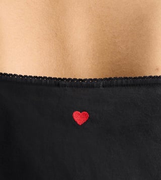 The Vintage Camisole is a wardrobe essential in black. Crafted in cotton, this slip will leave you feeling light as air. Triangular lace adorns the neckline and hemline of both the front and back. A heart embroidery sits behind in red.