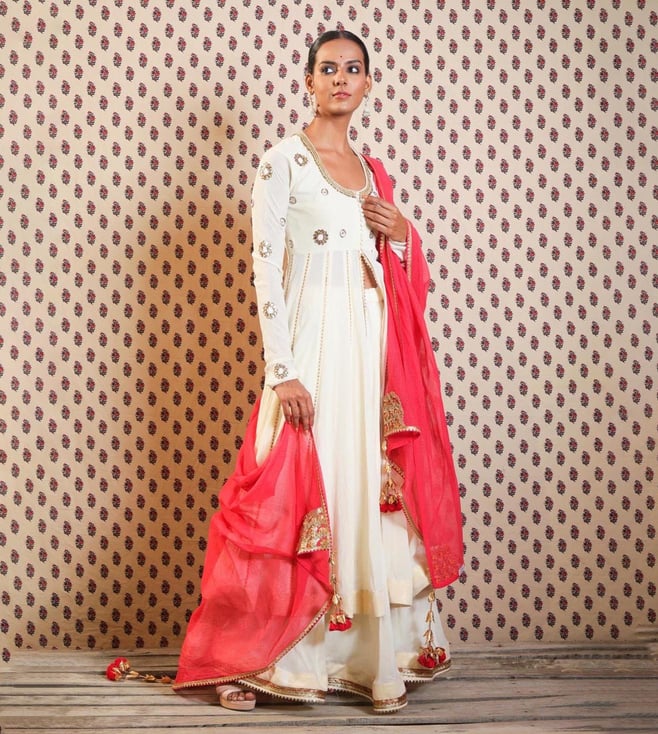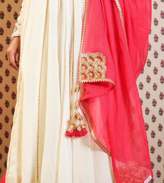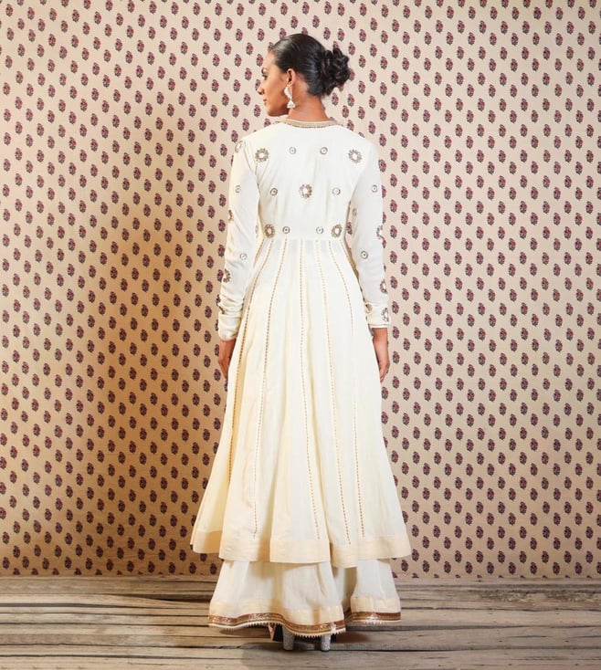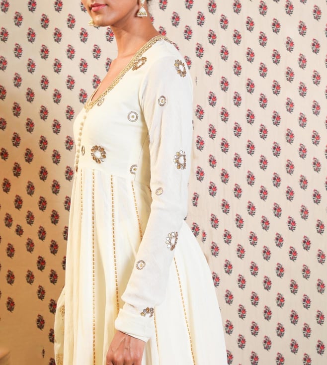 This hand woven cotton jamdani anarkali features hand embroidered motifs. Each motif is hand embroidered in antique gold, dabka and zardosi and neckline with antique coin hand embroidery. It is paired with soft gauze cotton skirt with antique gota border and dupatta in hand woven kota doria. Disclaimer: Product colour may slightly vary due to photographic lighting sources. Country of Origin - India.