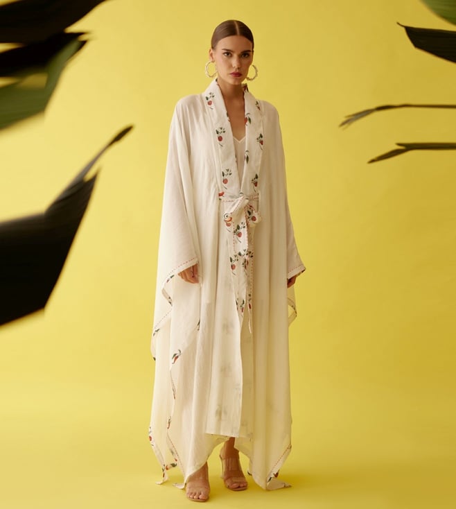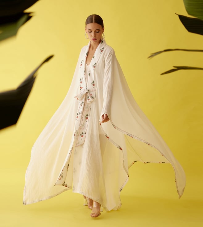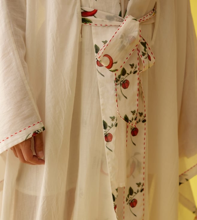Add a hint of feminine grace to your attire by wearing this overgarment. It is curated with 100 percent cotton. It comes with hand-painted chilli print details and hand-stitched details. Disclaimer: All other items in the image are only for display purposes and will not be a part of the delivery content. Product colour may slightly vary due to photographic lighting sources. Country of Origin - India.