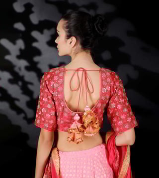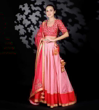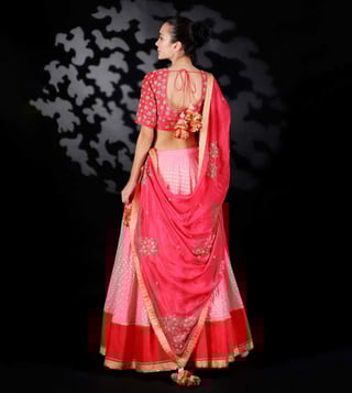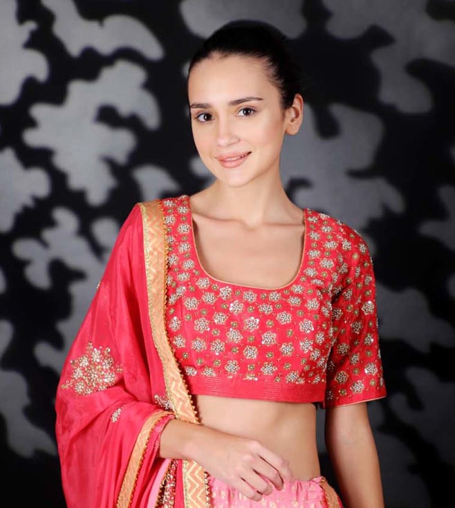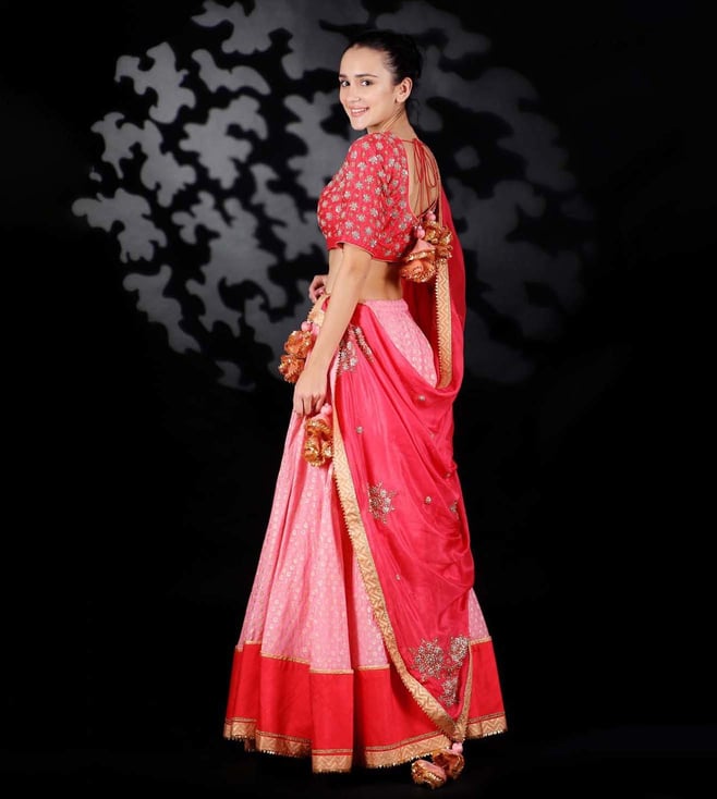 The fully hand embroidered blouse has been paired with a lehenga in printed design and border details. This hand-embroidered dupatta complements them well. It has been made using matka silk, cotton silk and chinon chiffon. It comes from the Rani 2021 collection. Disclaimer: Product colour may slightly vary due to photographic lighting sources. Country Of Origin - India.