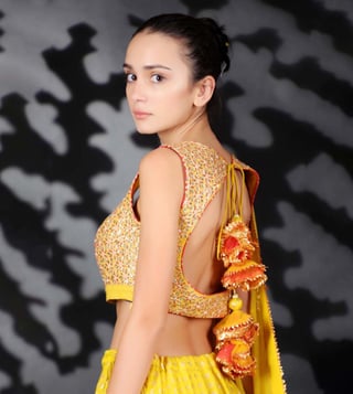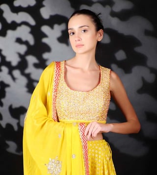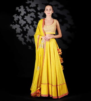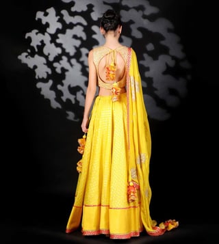 The fully hand embroidered gota blouse has been paired with a fully printed lehenga having border details. The hand-embroidered dupatta complements it really well. It has been made using matka silk, cotton silk and chinon chiffon. It comes from the Rani 2021 collection. Disclaimer: Product colour may slightly vary due to photographic lighting sources. Country Of Origin - India.