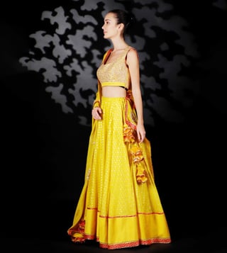 Nikasha Pitambari Yellow Matka Silk Embroidered Blouse with Cotton Silk Gold Print Lehenga & Dupatta