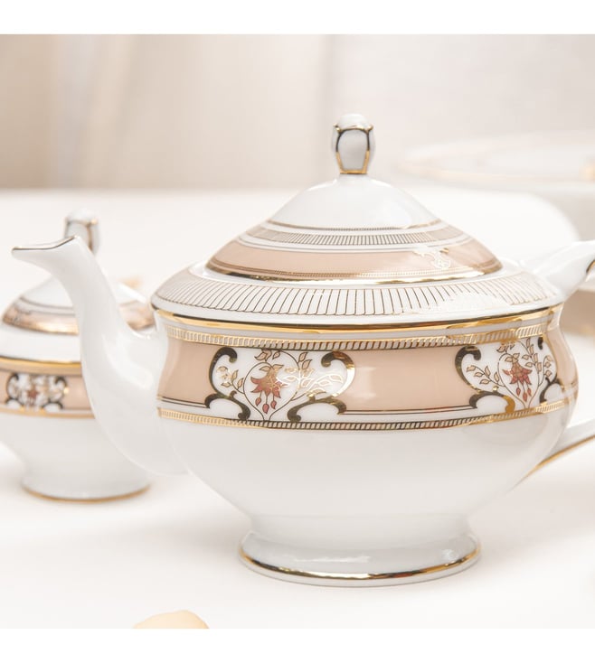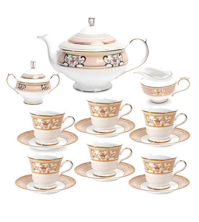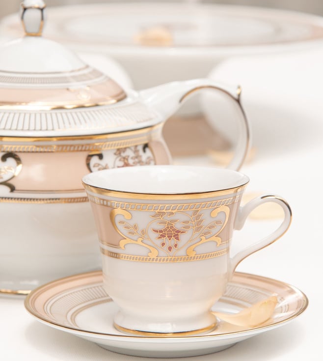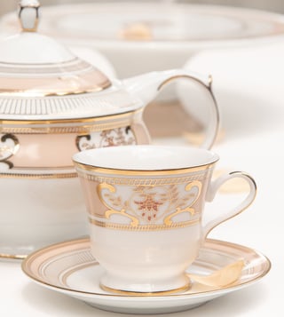 Perfect the art of an opulent high tea party with the 15-piece tea set from the Blush of Fuchsia collection. Handcrafted with 24 carat gold along with the softest peach and gold-laced geometric borders. Each piece exemplifies a cohesive design language that is both intuitively unique and strikingly elegant. The tea set comprises a teapot, creamer, sugar pot, 6 teacups and 6 saucers. This collection also features coffee mugs, biscuit trays, cake stands and appetizer plates.
