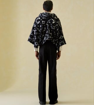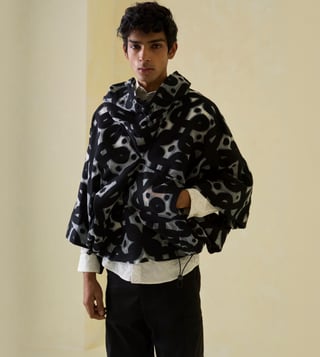Presenting our Anorak, expertly crafted from sheer-twill jacquard fabric featuring our signature branded Kolam print. Inspired by the traditional square Indian blouse, this oversized directional style exudes contemporary flair. Designed with sustainability in mind, the silhouette follows a zero-waste pattern, offering an eco-conscious choice for your wardrobe. With its adjustable size and utilitarian pockets, this Anorak seamlessly combines fashion with functionality, ensuring both style and practicality in every wear.