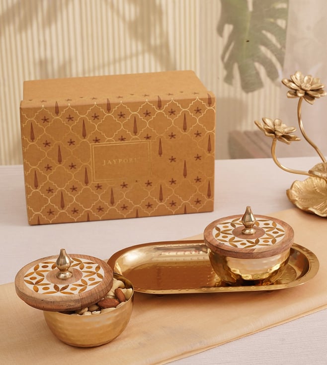 Golden Stainless Steel & Wood Hand Crafted Nut Bowls & Tray Set