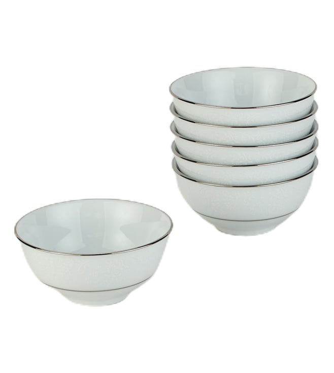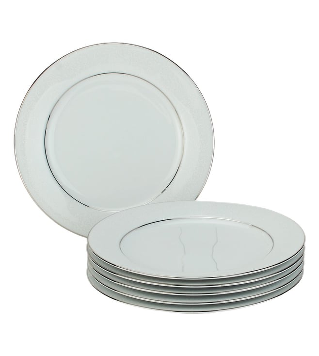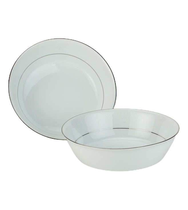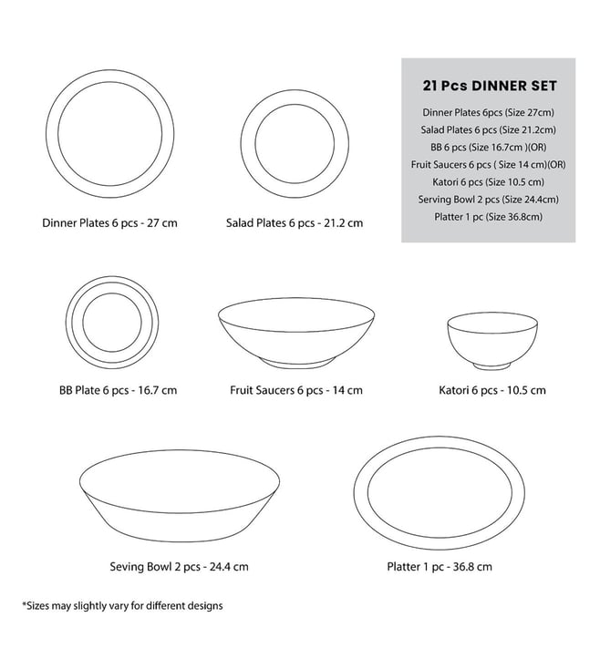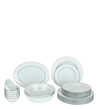 This fine translucent dinnerware set boasts a raised white enamelled floral decal on pristine porcelain. Finished with a beautiful platinum trim, it is meant to complement, no matter what your table settings. The set contains - The set contains - 6 X Dinner Plates, 6 X Salad Plate, 6 X Fruit Saucer, 2 X RD Vegetable, 1 X Oval Platter.