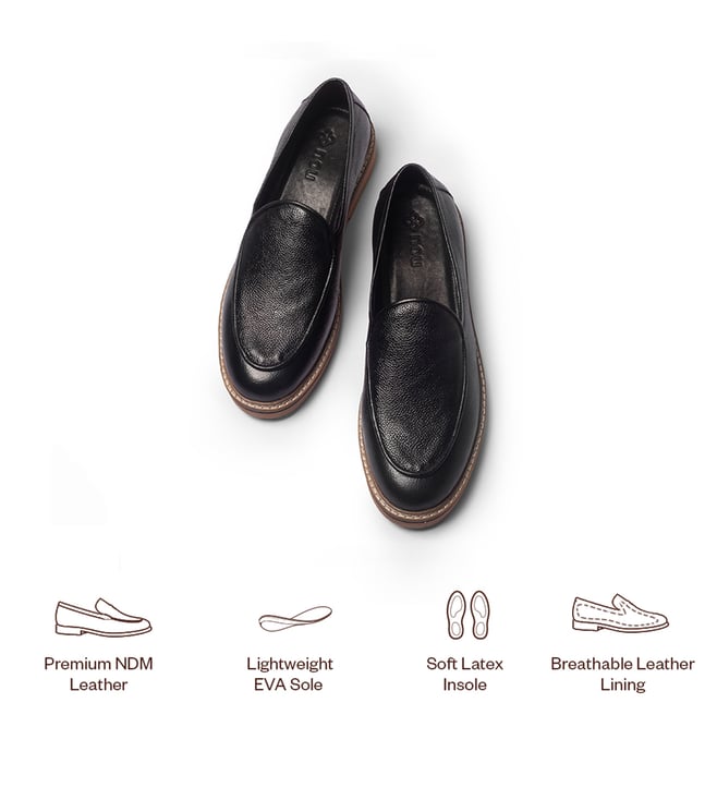Sharp and timeless, the Black Slip-On is made from rich NDM leather with a clean, structured profile. Cemented construction and hand finishing ensure strength and finesse, while the latex insole provides everyday comfort. The EVA sole keeps it lightweight yet reliable for daily use. Designed in classic black, it works seamlessly across formal and casual outfits, proving itself as a versatile pair that every wardrobe deserves. Occasions: Formal events, office wear, versatile daily looks Color: Black Material: Crust Leather