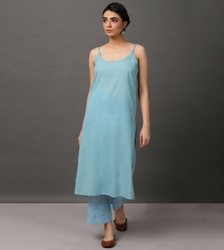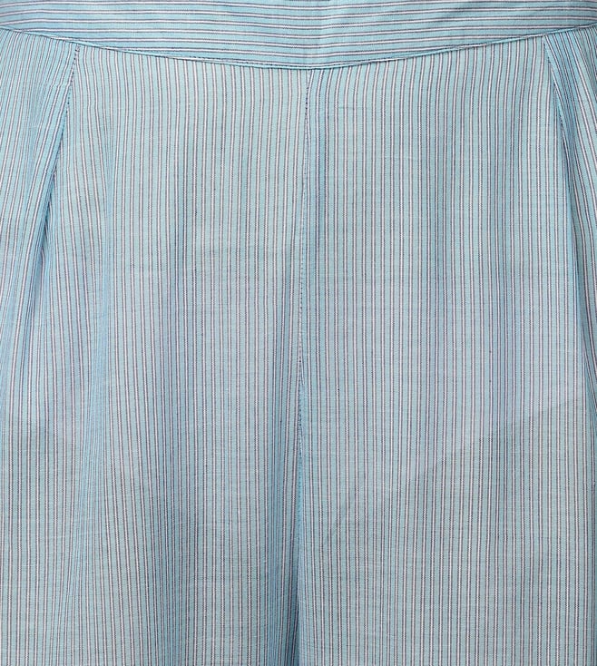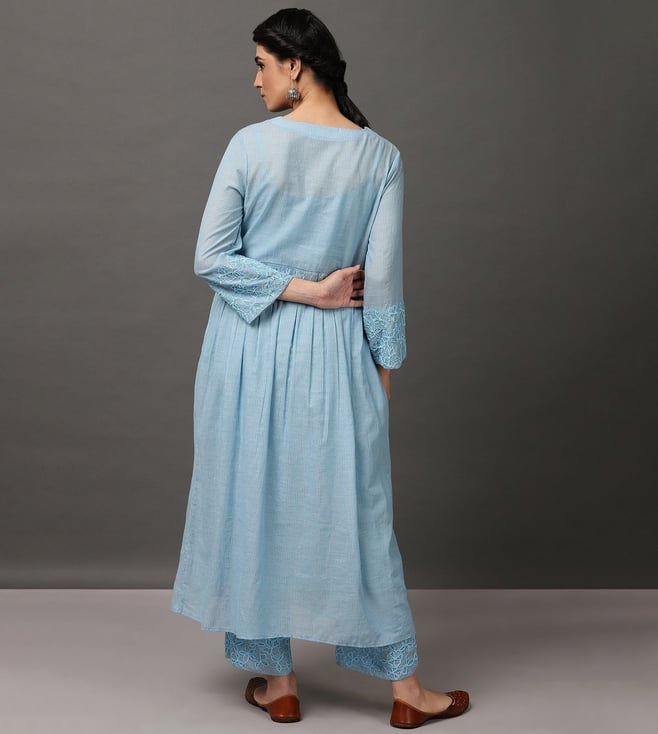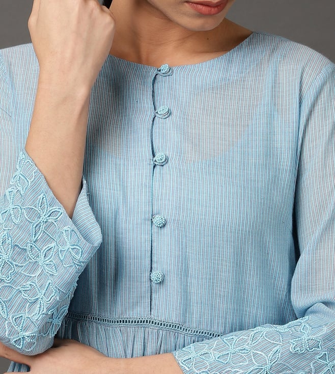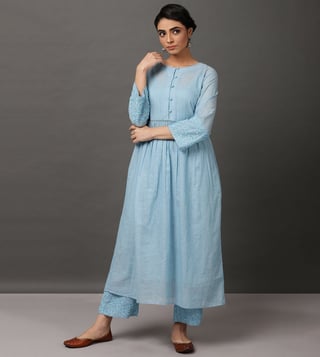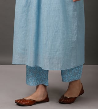 Achieve a magnetic look by wearing this light blue suit set from the sukoon collection by Nuhh. The blue self striped kurta & pant set with hand embroidery of thread & beads at sleeves and bottom end looks phenomenal. Team it with a pair of juttis to create a lasting impression on the onlookers. Disclaimer : Product colour may slightly vary due to photographic lighting sources.