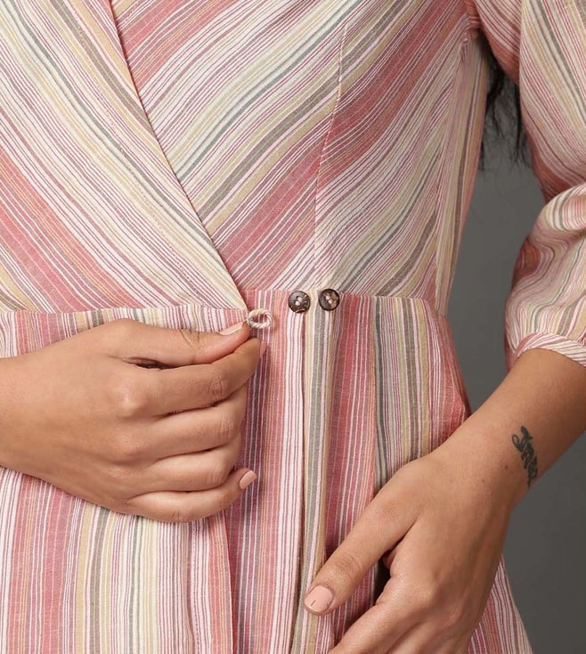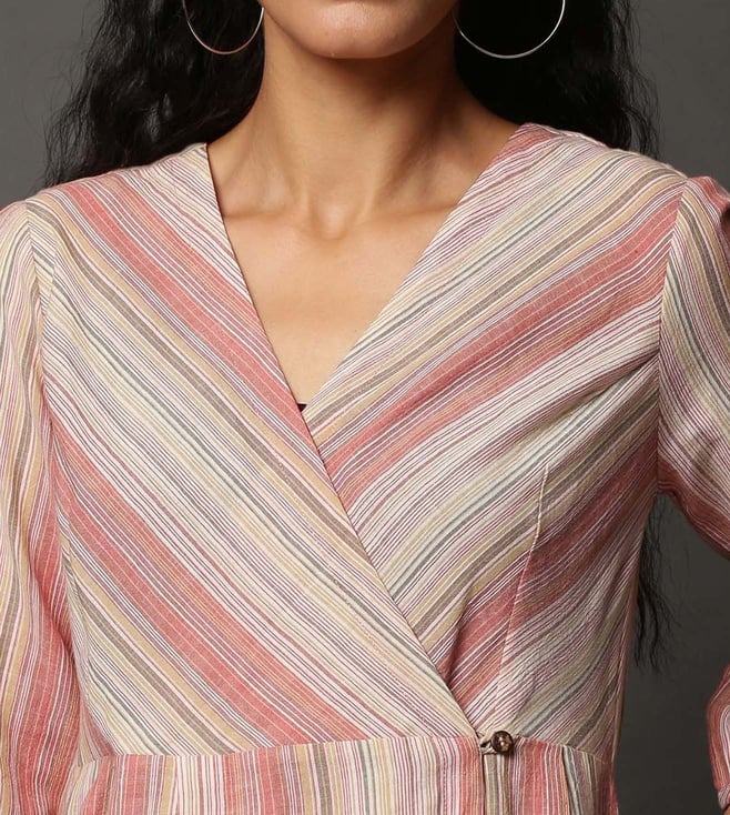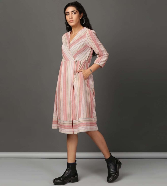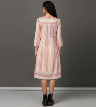 Radiate trendy vibes by wearing this coral and multicoloured dress from the Holiday collection by Nuhh. Tailored to sartorial perfection from 100 percent cotton fabric, it assures a soft and soothing touch against the skin. The V-neckline adds to its appeal. Featuring three-fourth sleeves, it will surely impress your peers. It emanates a striped pattern which makes it a unique choice. Disclaimer : Product colour may slightly vary due to photographic lighting sources.