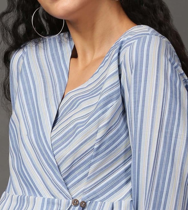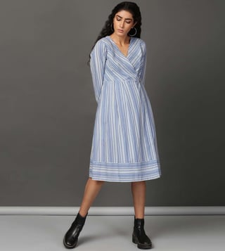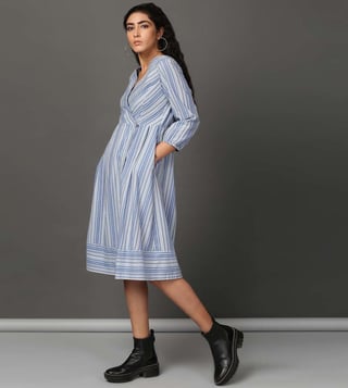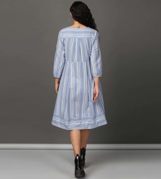 Create a lasting impression on the onlookers by wearing this blue and multicoloured dress from the Holiday collection by Nuhh. Tailored from 100 percent cotton fabric, it assures a soft and soothing touch against the skin. The V-neckline adds to its appeal. Featuring three-fourth sleeves, it will surely impress your peers. It emanates a striped pattern which makes it a unique choice. Disclaimer : All other items in the image are only for display purposes and will not be a part of the delivery content. Product colour may slightly vary due to photographic lighting sources.