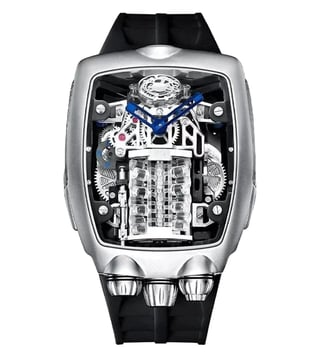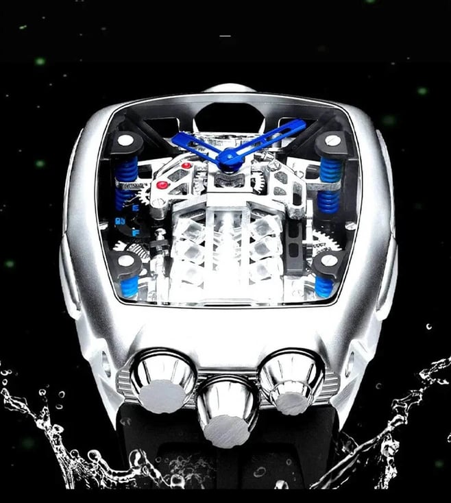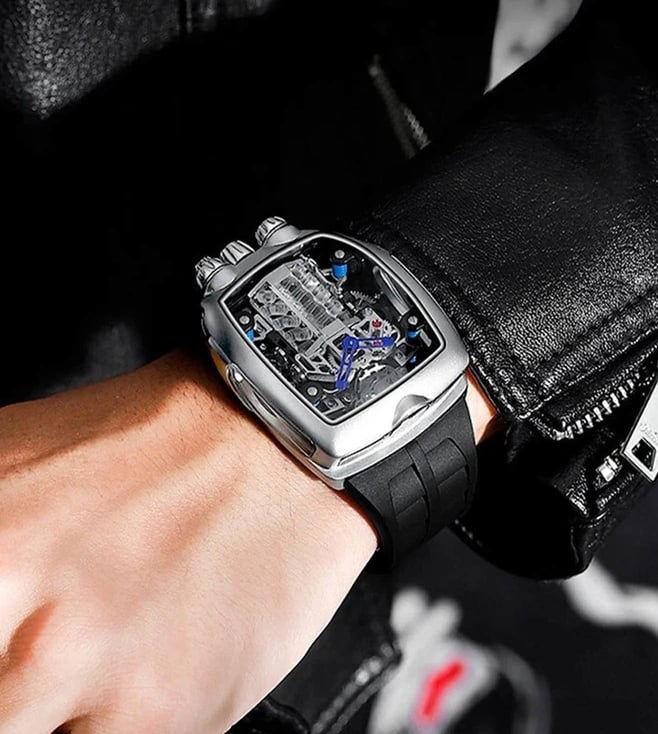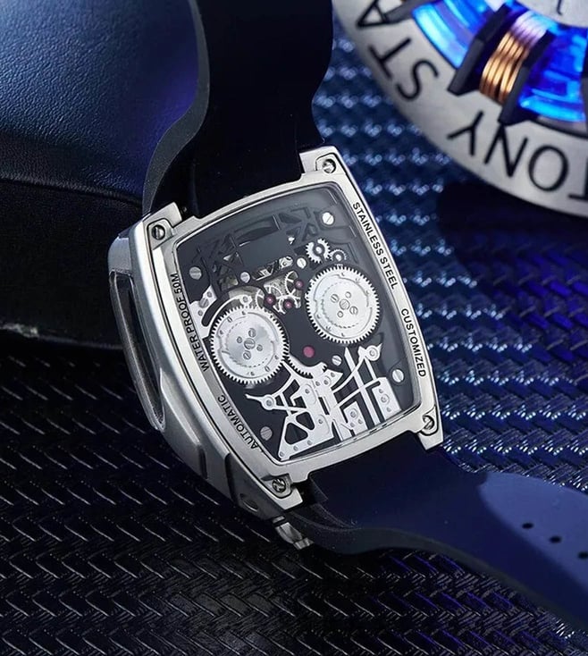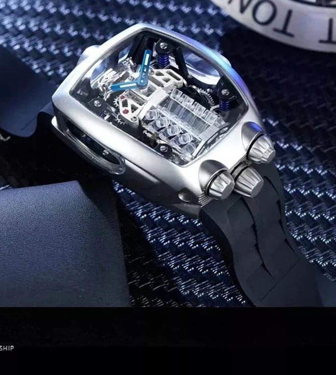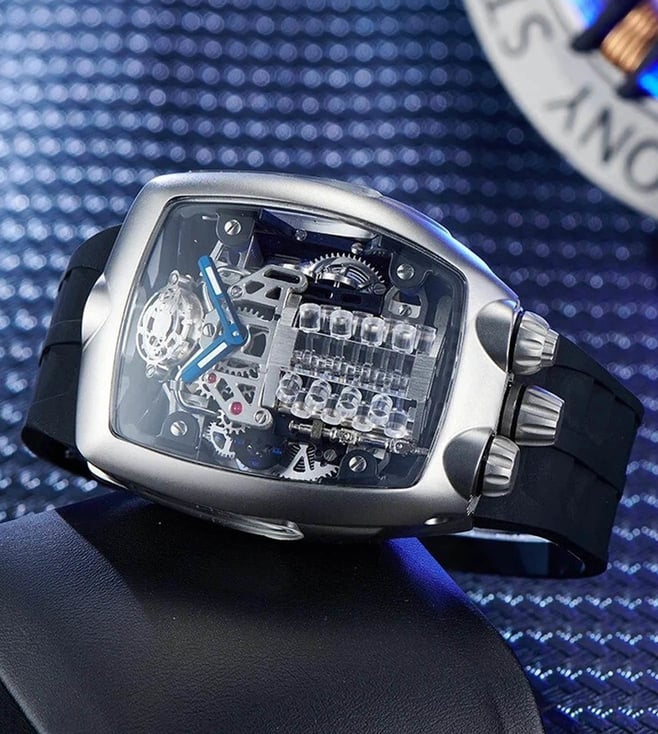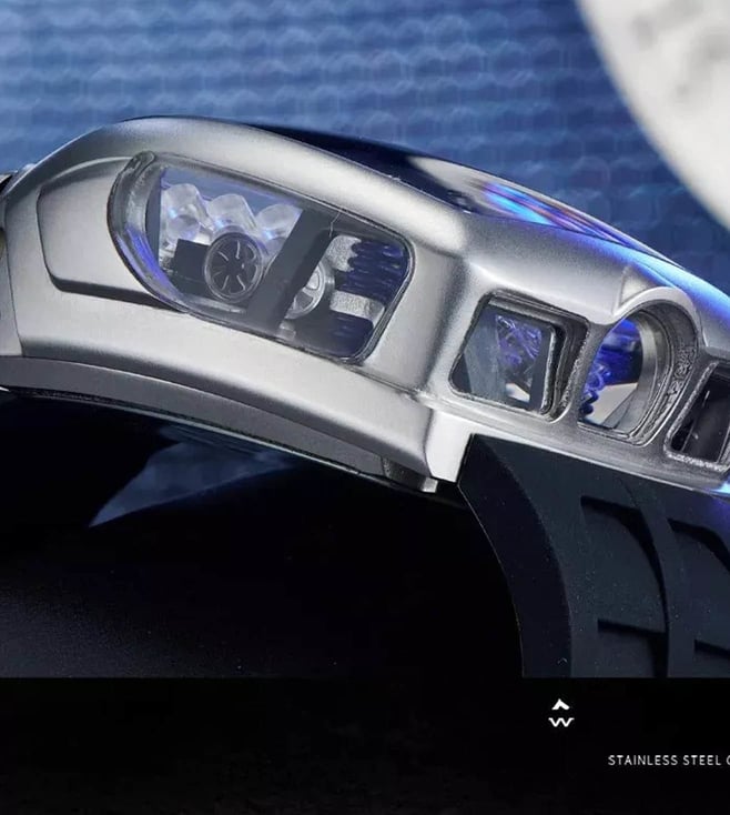 This luxury watch from Oblvlo features an intricate and avant-garde design, powered by a precise Miyota tourbillon movement known for its exceptional accuracy and craftsmanship. Its transparent dial reveals the complex mechanical gears and components, showcasing the elegant tourbillon mechanism that enhances timekeeping stability. The robust yet elegantly shaped case is crafted from polished metal, radiating sophistication and durability. Striking blue hands provide a sharp contrast against the mechanical backdrop, improving readability while adding aesthetic appeal.
