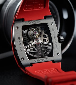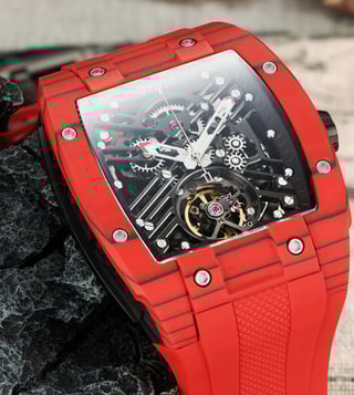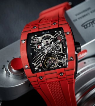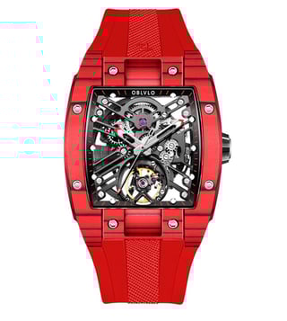 This OBLVLO masterpiece is a true symbol of modern luxury and refined craftsmanship. The bezel, meticulously crafted from high-grade carbon fibre, exudes strength, sophistication, and exclusivity. At its core lies a mesmerizing skeleton automatic movement, a celebration of horological artistry where every gear and bridge is elegantly revealed for an unbroken view of mechanical perfection. The intricate openwork dial showcases the seamless dance of precision engineering, offering a living spectacle of time in motion. Its bold tonneau-shaped case enhances its majestic presence, while the vibrant