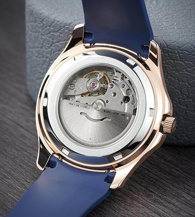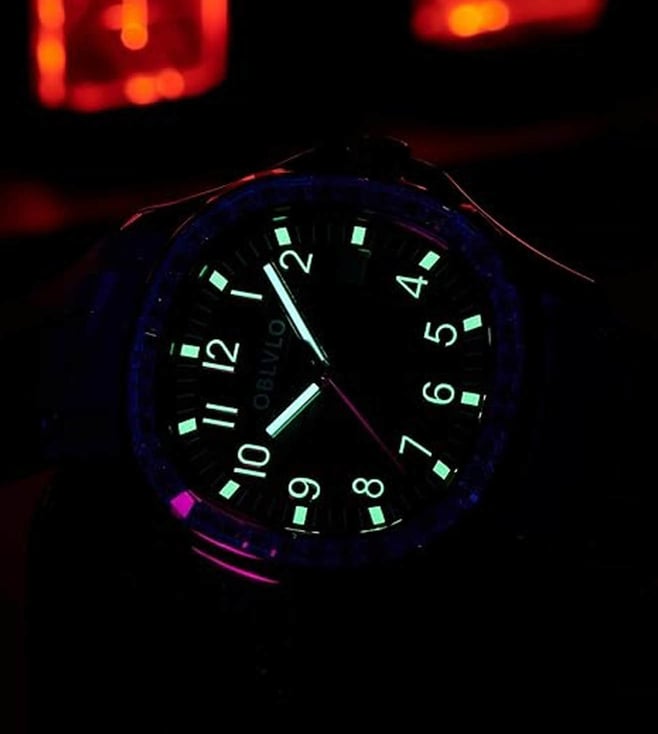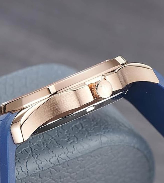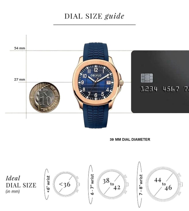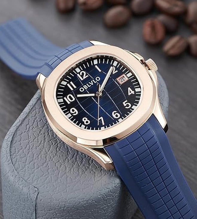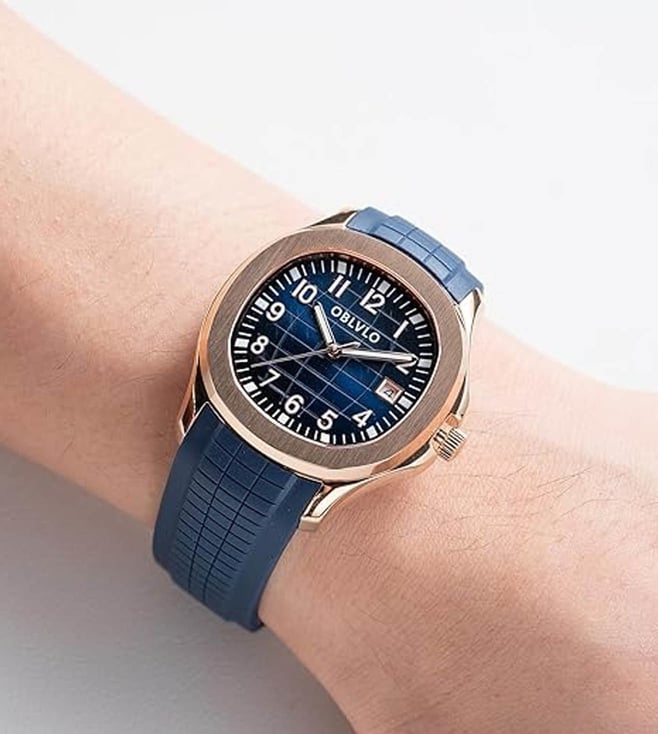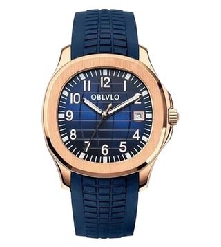 This luxurious watch by OBLVLO showcases a stunning fusion of elegance and sporty design. The rose gold-toned case contrasts beautifully with the deep blue textured dial, exuding refined sophistication. Its bold white numerals and luminous hands ensure excellent legibility, even in low light. The date window at 3 o clock adds a practical touch, framed subtly in gold for a cohesive look. The patterned rubber strap in navy blue enhances comfort while maintaining a modern aesthetic. A sweeping second hand and a precisely angled date magnifier reflect the meticulous craftsmanship.