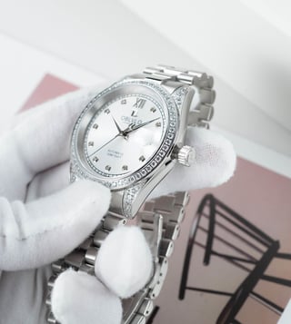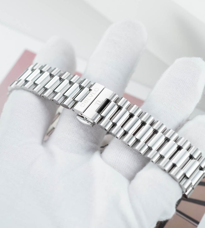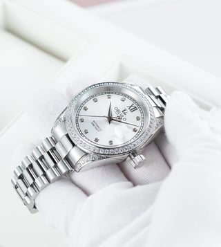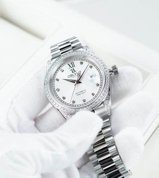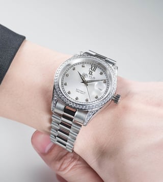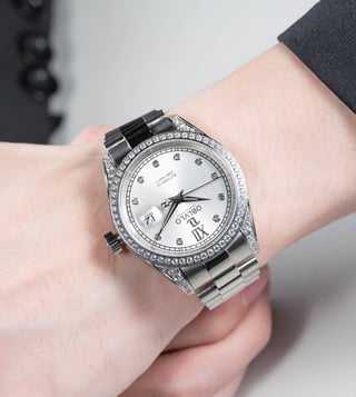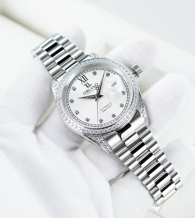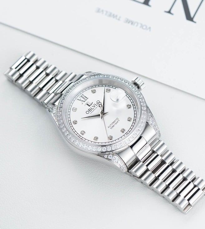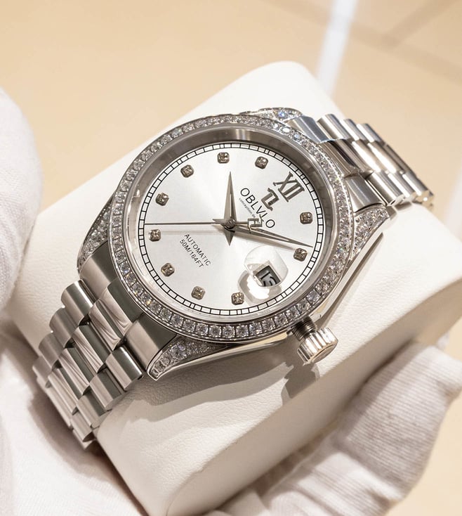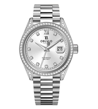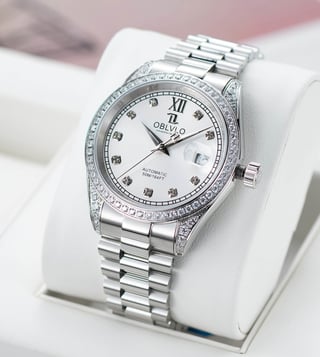 Experience the epitome of refined elegance with this stunning OBLVLO luxury timepiece. Its lustrous silver sunray dial is adorned with brilliant diamond hour markers, each shimmering like a star in a clear night sky. Encased in polished stainless steel, the bezel is encrusted with radiant crystals, creating a halo of brilliance around the dial. A magnified date window at 3 o clock offers both style and utility in perfect harmony. At its heart beats the dependable Miyota 8215 automatic movement, renowned for its precision, longevity, and seamless performance.