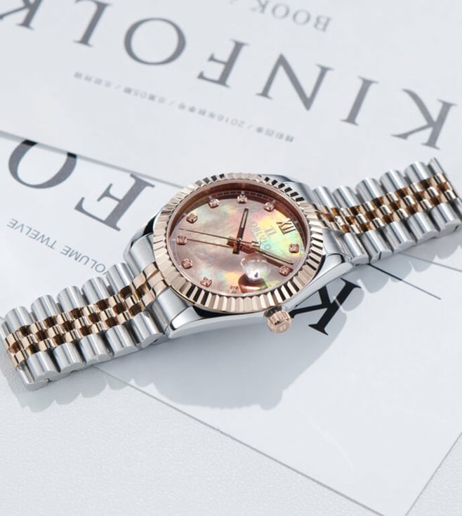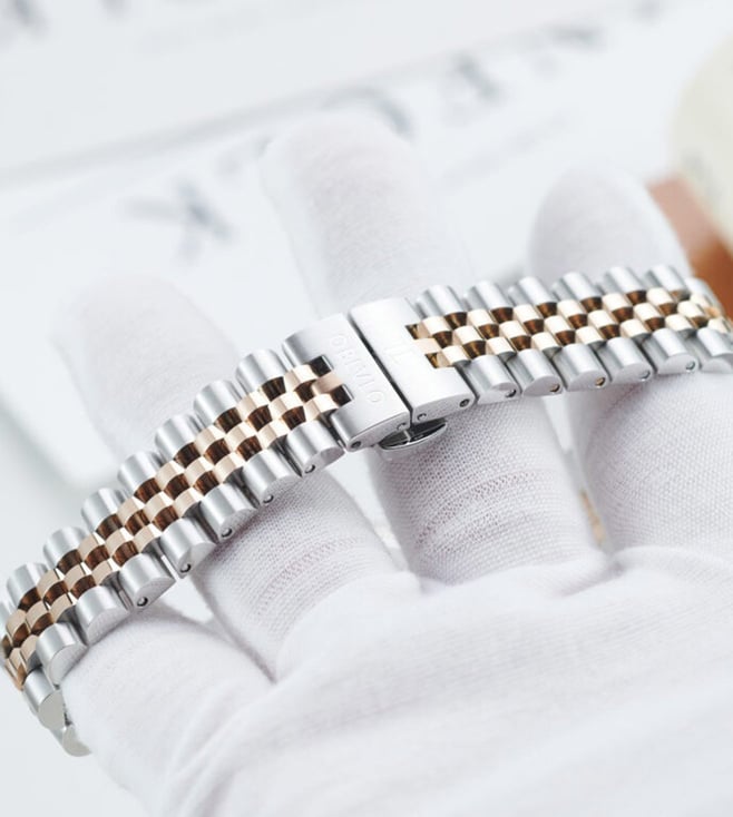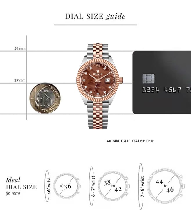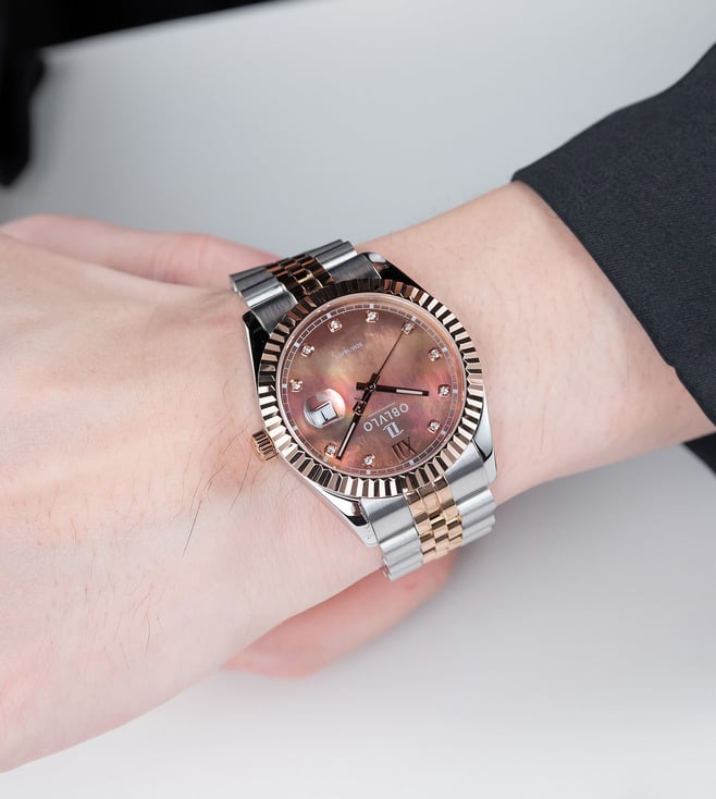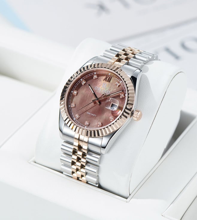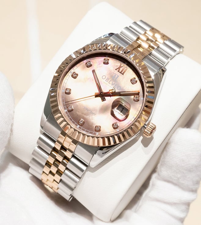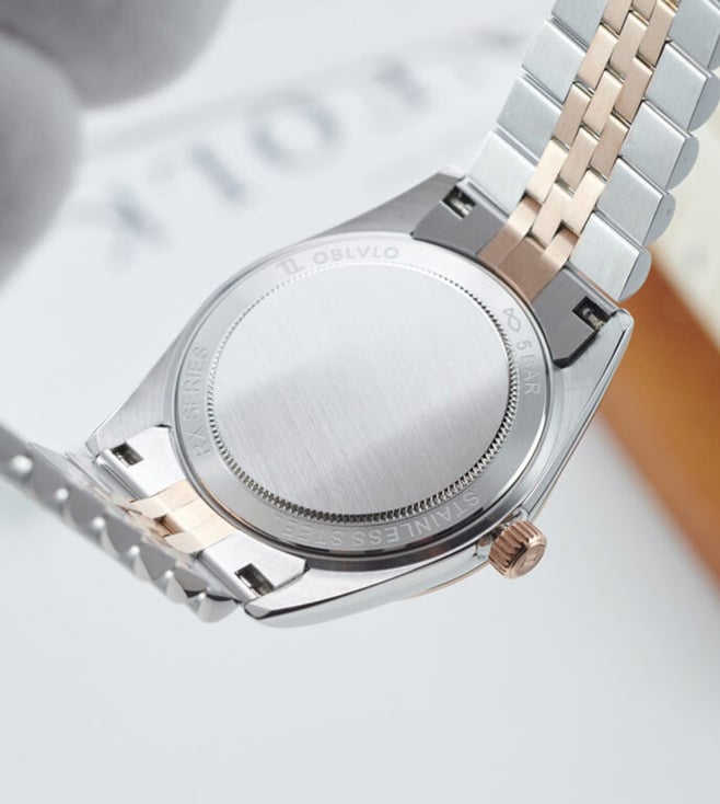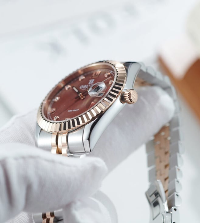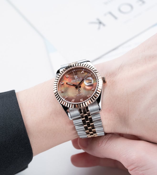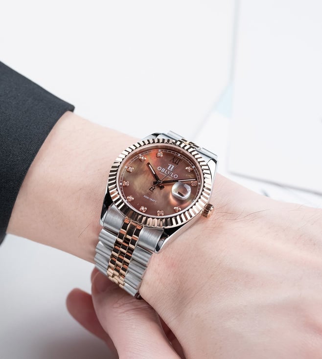 The OBLVLO luxury timepiece is a true embodiment of elegance, precision, and refined artistry. Its captivating chocolate-brown dial, adorned with radiant diamond hour markers, reflects a brilliance that transcends time. Encased within a meticulously polished two-tone body of rose gold and stainless steel, the watch exudes sophistication from every angle. The signature fluted rose-gold bezel elevates its design, symbolizing heritage and prestige in the world of horology. At its heart beats the Swiss Ronda 505 Quartz Movement, renowned for its uncompromising accuracy and enduring reliability. A