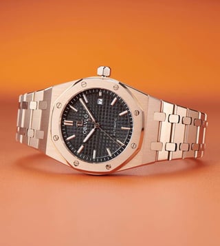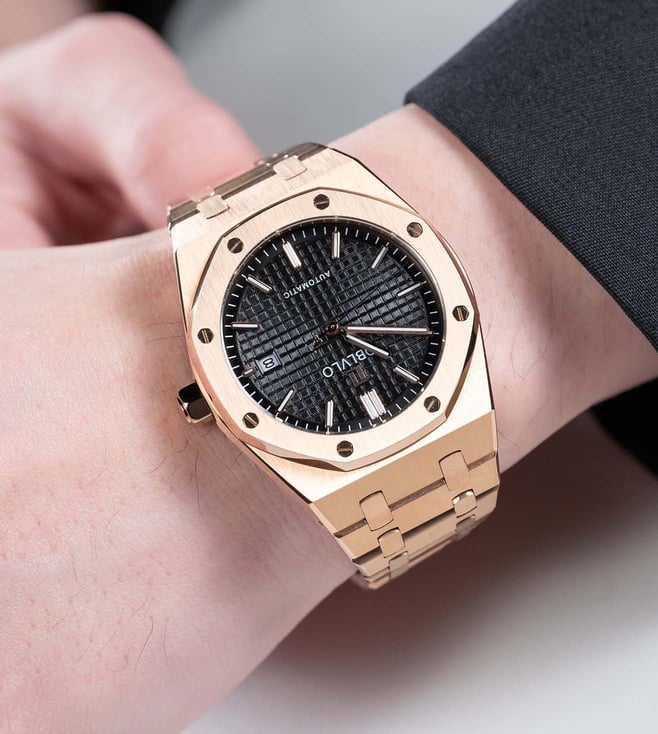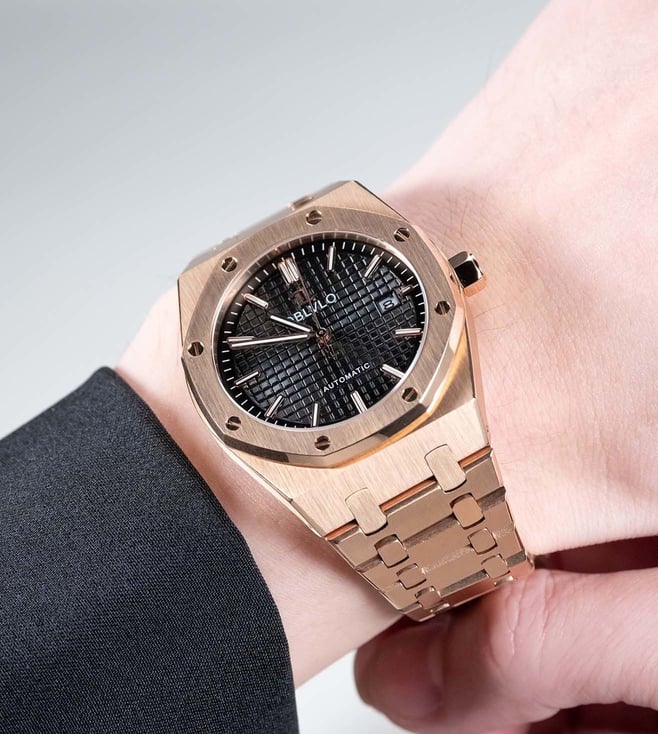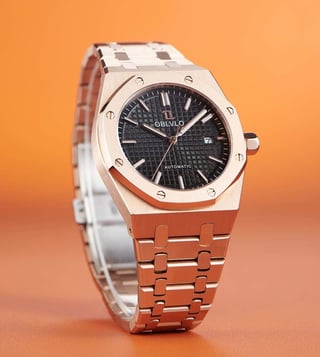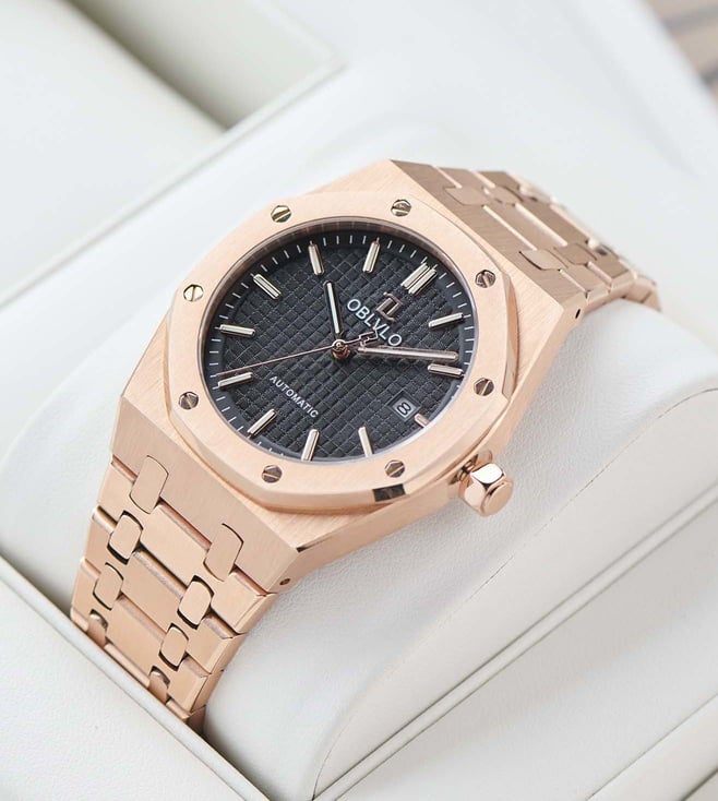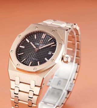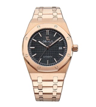 The OBLVLO Automatic is a masterpiece of horological artistry, created for those with a taste for true luxury. Its case and bracelet, crafted in radiant rose gold stainless steel, exude an aura of opulence, seamlessly merging strength with timeless elegance. The iconic octagonal bezel, secured with polished screws, reflects a bold architectural charm reminiscent of haute horlogerie. At its heart lies a refined textured black dial, a canvas of sophistication, adorned with luminous indices and slender hands that dance gracefully with each passing second. The discreet date window at 3 oclock off